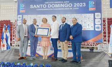 DISTINCIÓN. Bajo el marco de la celebración del Open Panamericano de Judo 2023, la Federación Dominicana de Judo (Fedojudo) le entregó un reconocimiento a Matilde Cruz de Farach, presidenta de la Fundación Farach, por sus significativos aportes al deporte y al crecimiento de la sociedad dominicana.