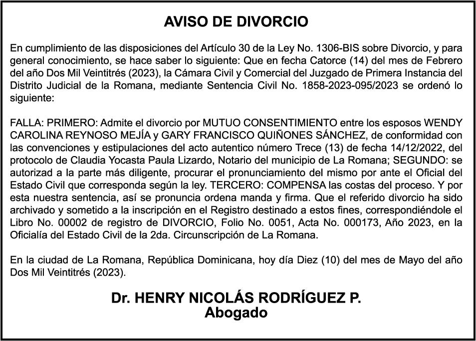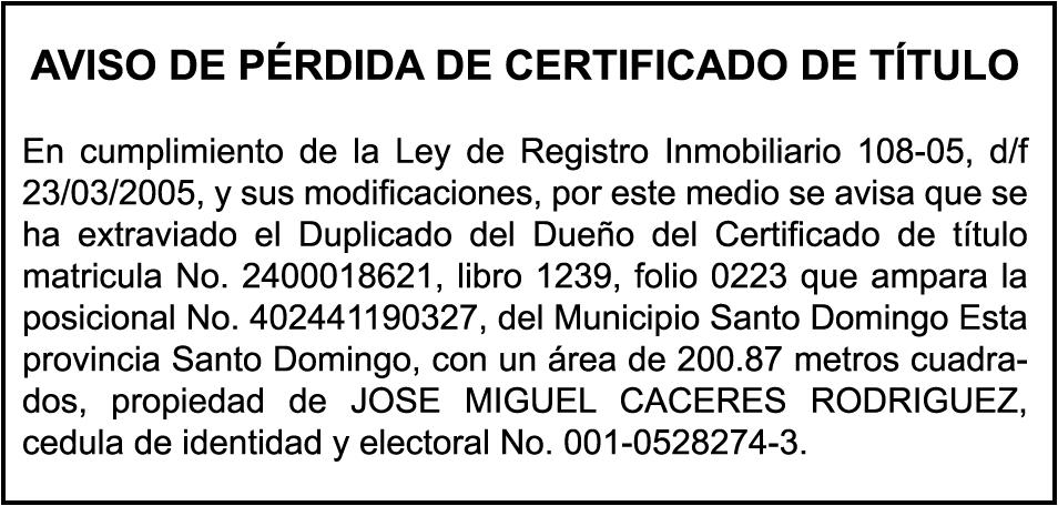PERDIDA DE MATRICULA: De La Motocicleta, Placa N331511, Chasis DE02X039952, Marca YAMAHA, Modelo DT125S, Color BLANCO, AñO 2007, a nombre de CESAR CASTILLO GONELL, Ced. 04100051434 AVISO DE TRASPASO DE EMBARCACION el Sr. MARCEL FELIPE ENCARNACION DE PEÑA, le traspasa a la Sra. MARIA ALTAGRACIA RODRIGUEZ GARCIA, Ced. No. 085-0007672-7, una embarcación de nombre VITTORIA-III, color BLANCO, de eslora 29’ 0”, manga 8’ 0” y puntal 3’ 8”, de matrícula no. BR-V242620SDG, Construida en FIBRA DE VIDRIO.