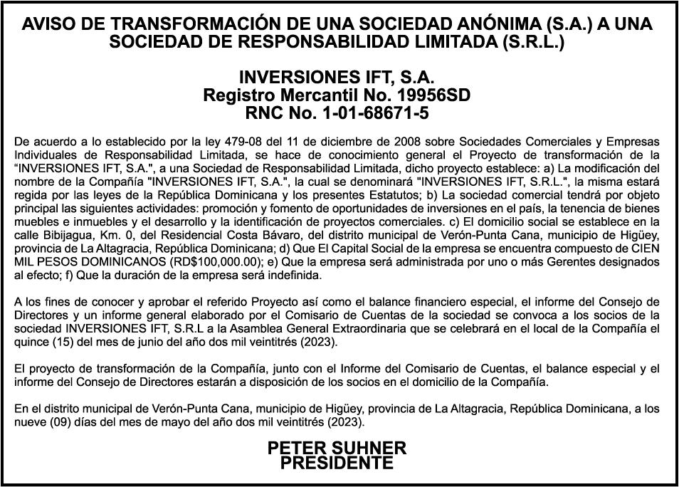 PERDIDA DE PLACA No. L40485, Veh. Carga FORD, Modelo F150 XLT 4X4,, Color gris, Año 2016, Chasis 1FTEW1E89GFA15838, a nombre de ALBERTO POLONIO HEREDIA MARTINEZ. AVISO:TRASPASO DE EMBARCACION. LA Compañía AMILKA TOURS, S.R.L., titular del RNC. No. 1-10-124309, representada por el Señor ROLANDO REYES, traspasa la embarcación de nombre “SOPHIA”, matricula. No. CT-S842024SBS de 51.7 pies de eslora, color Blanco , a los Señores. ANTONIO GARCIA CHACON y BEGOÑA CELAYA GONZALEZ, como nuevos propietarios.