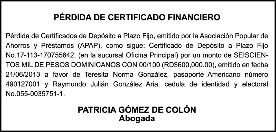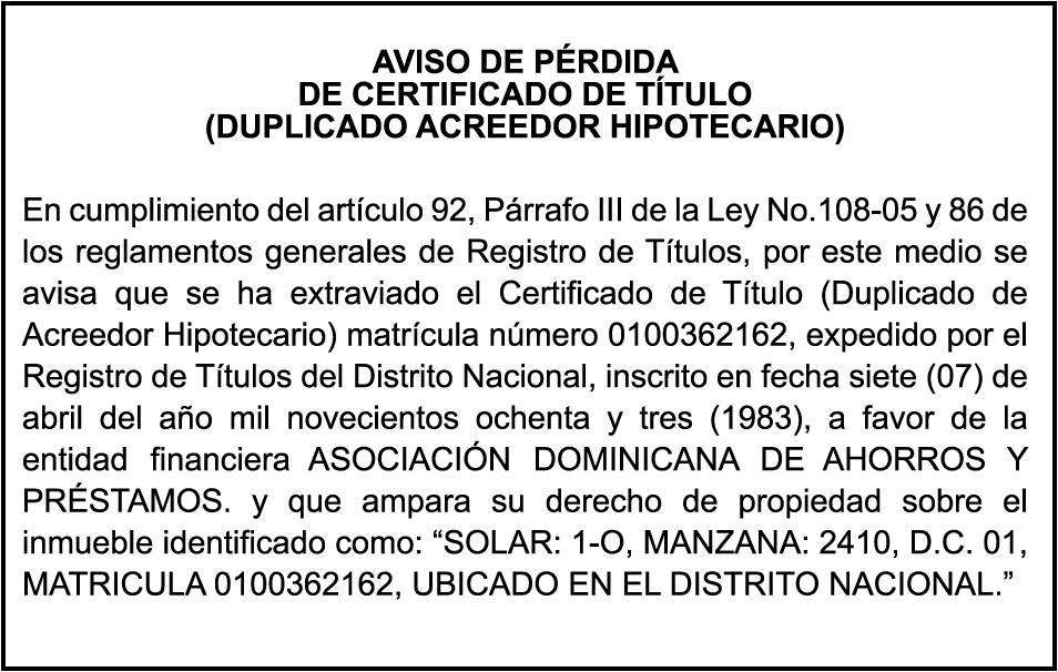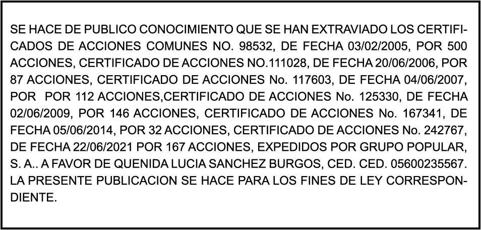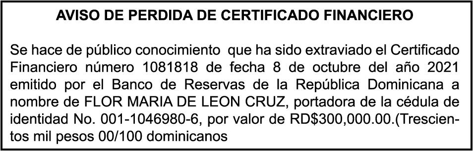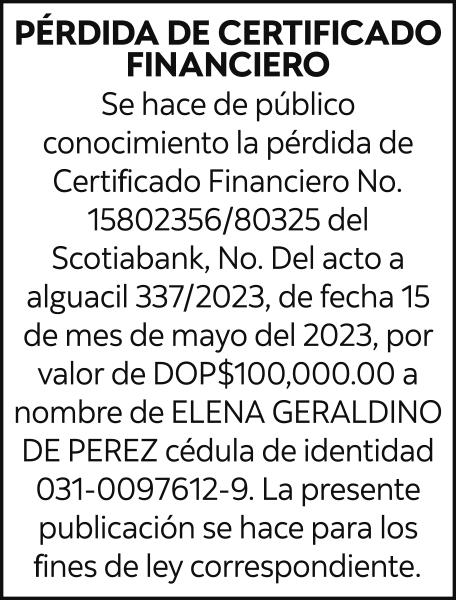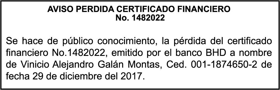 K1870834, Motocicleta SUZUKI, Modelo AX100, Color NEGRO, Año 2019, Chasis LC6PAGA11K0011504, a nombre de CHUBY V B COMERCIAL SRL. SE hace de público conocimiento la pérdida de certificado de depósito número 827699224 emitido por Banco Popular Dominicano, S. A., a favor de WILTON ANTONIO RAMIREZ FULGENCIO, Portador de la Cedula de Identidad y Electoral número 023-0135018-3, expedido en fecha 13 de mayo de 2022 por el monto de (RD$115,451.52).