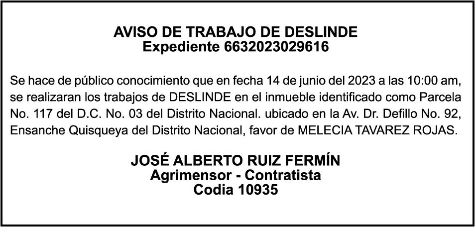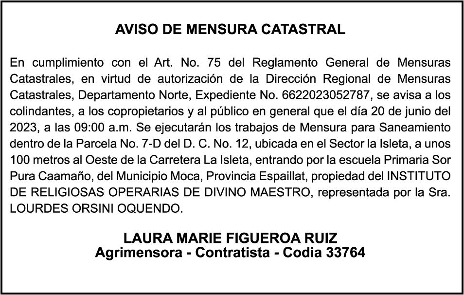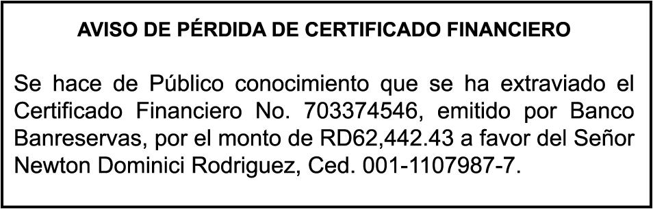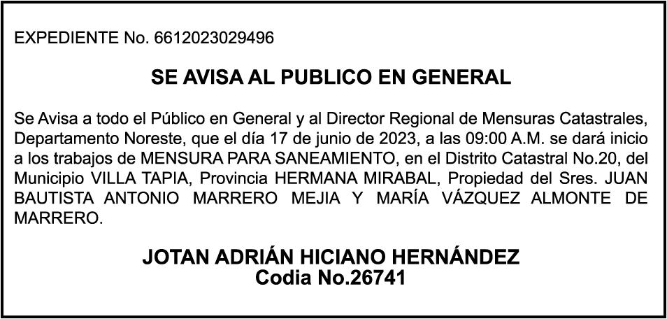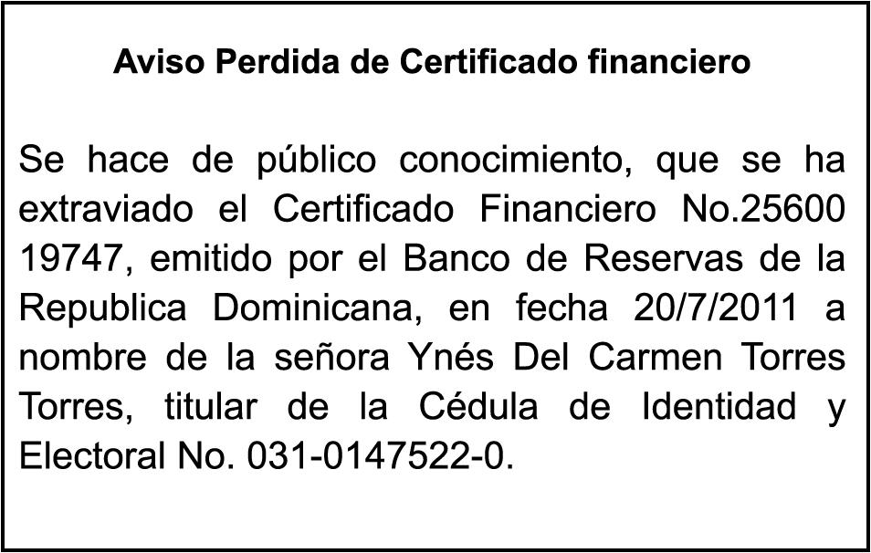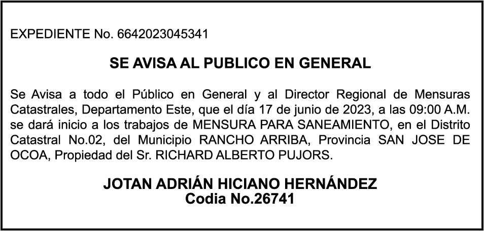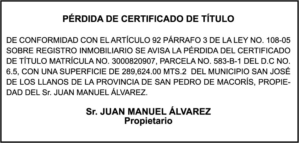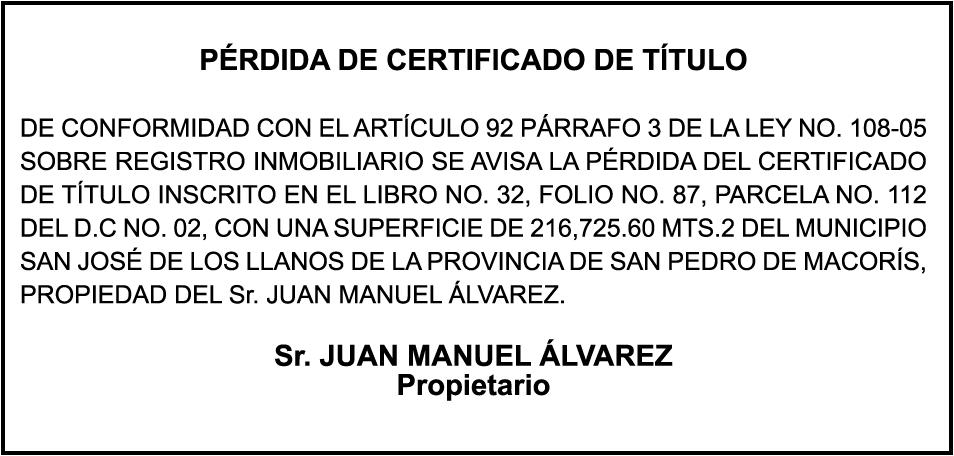 "SE hace de dominio público que se ha extraviado el título del inmueble con una extensión superficial de (14) hectáreas, (67) áreas, (21) centiáreas, en la parcela No.206-Q-24 del D.C. No. 47/2da, registrada en el libro No. 790, folio 383, certificado de título No. 97-944 a nombre de Rosa María Peña Rodríguez e Ismael Peña Rodríguez inmueble ubicado en La Rinconada del Distrito Municipal de Uvero Alto, ciudad de Higüey, provincia La Altagracia"