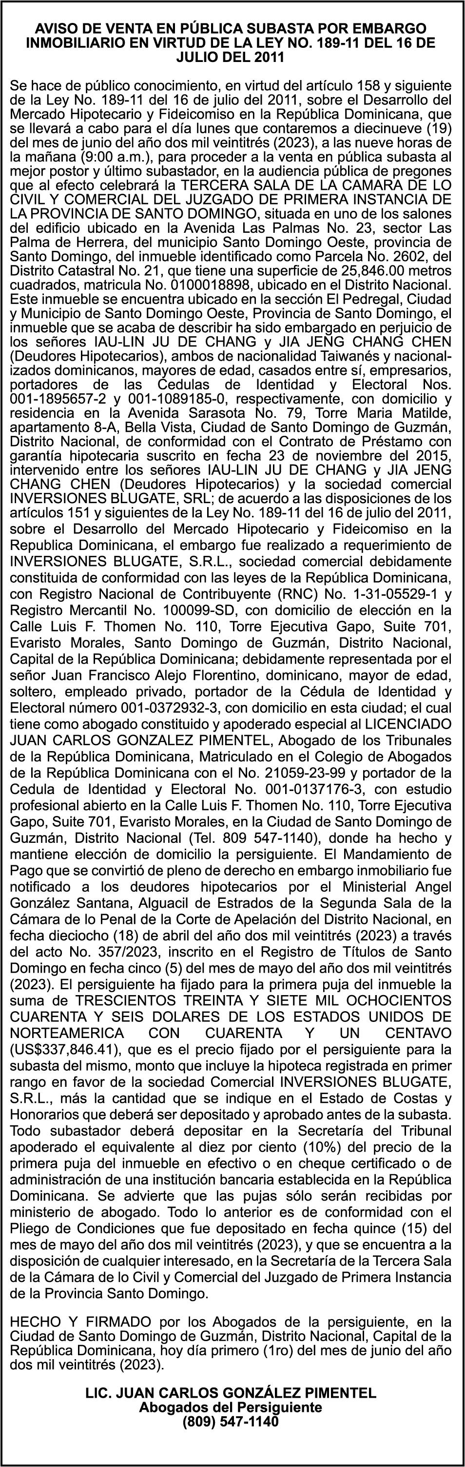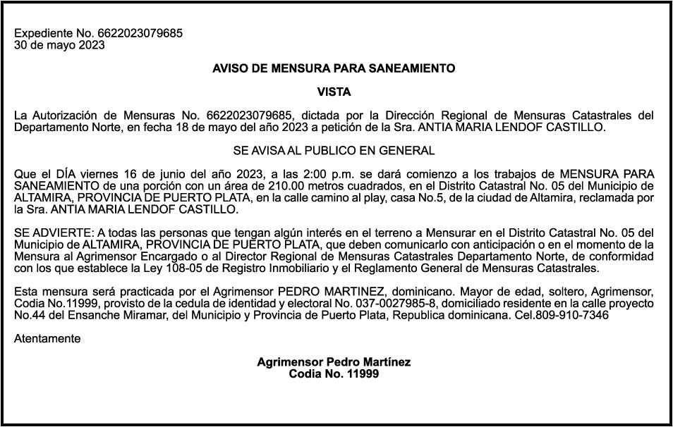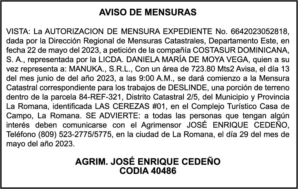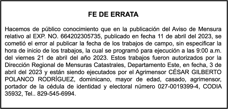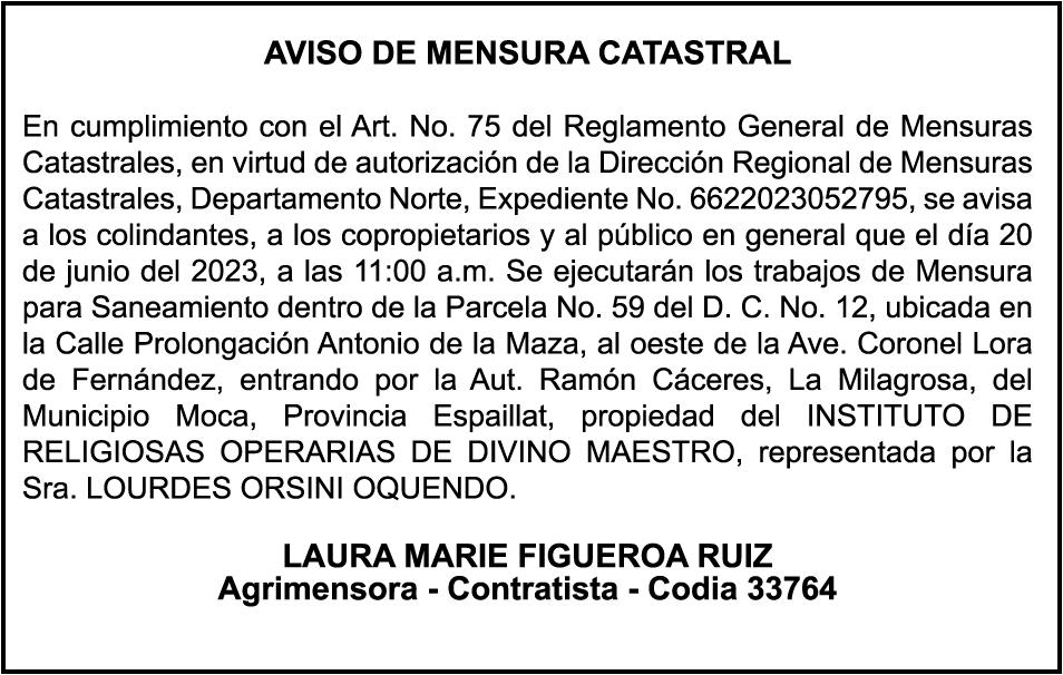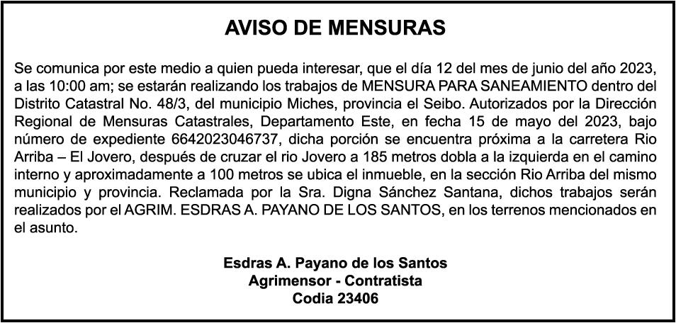 "SE hace de dominio público que se ha extraviado el título del inmueble con una extensión superficial de (14) hectáreas, (67) áreas, (21) centiáreas, en la parcela No.206-Q-24 del D.C. No. 47/2da, registrada en el libro No. 790, folio 383, certificado de título No. 97-944 a nombre de Rosa María Peña Rodríguez e Ismael Peña Rodríguez inmueble ubicado en La Rinconada del Distrito Municipal de Uvero Alto, ciudad de Higüey, provincia La Altagracia"