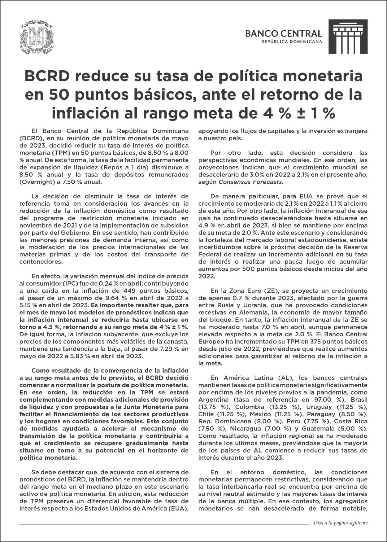 Por la reducción de la inflación BC baja 50 puntos a TPM