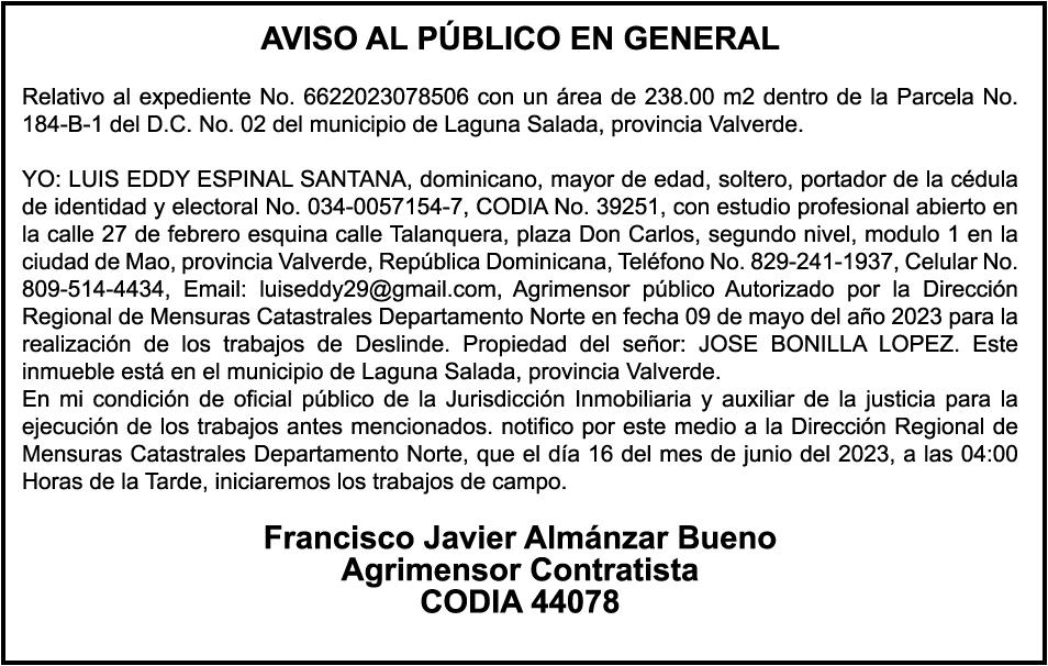 PERDIDA DE MATRICULA Automóvil Privado TOYOTA, Modelo COROLLA DX, Color rojo, Año 1992, Placa A325469, Chasis 1NXAE94A1N364274, a nombre de FREDIS CARABALLO LIRANZO. PERDIDA DE PLACA No. L445526, Veh. Carga TOYOTA, color BLANCO, año 2010, chasis MR0FZ29G601568647, a nombre de PUEBLO VIEJO DOMINICANA CORPORATION.