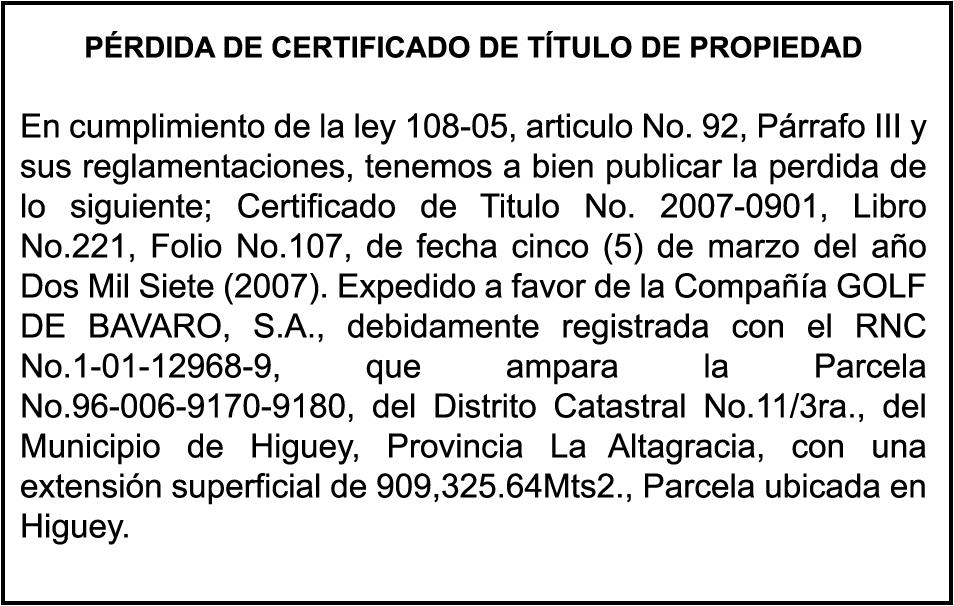 SE hace de público conocimiento las pérdidas de certificado de acciones números 37924, 42981, 45472, 49521, 52459, 54973, 83892, 88628, 94118, 100463, 107116, 124505, 136180, 144427, 152873, 177530, a favor de JUAN FRANCISCO SOTO ORTIZ portador de la cedula de identidad y electoral número 013-0037094-5, emitidos por Grupo Popular.