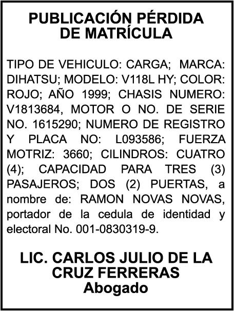 PERDIDA DE PLACA No. L081684, del Vehículo Privado marca ISUZU, modelo TFR55H-20, año 1999, color, BLANCO, chasis JAATFR55HX7104810, propiedad de RHADAMES HENRIQUEZ TEJADA.