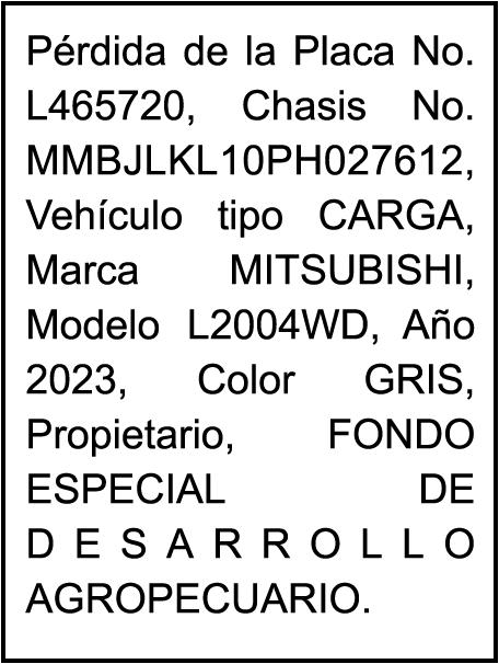 PERDIDA DE PLACA:NO. L164656, Chasis 2M2N187Y0JC021210, Marca MACK, Modelo RD688S, Color AMARILLO, AñO 1988, a nombre de ENIRSE VICTORIA RAMOS CARRASCO, Ced, 04400235778 PERDIDA DE PLACA No. K1310363, Motocicleta YAMAHA, modelo JOG