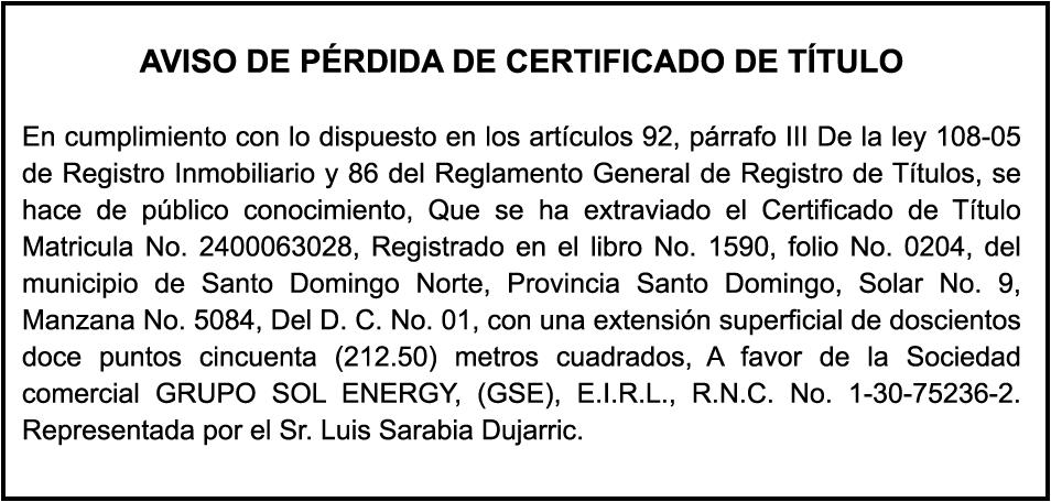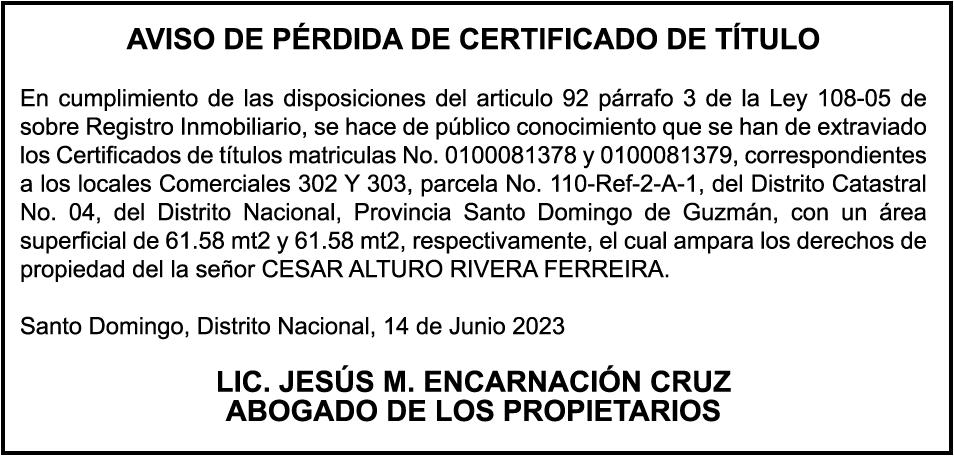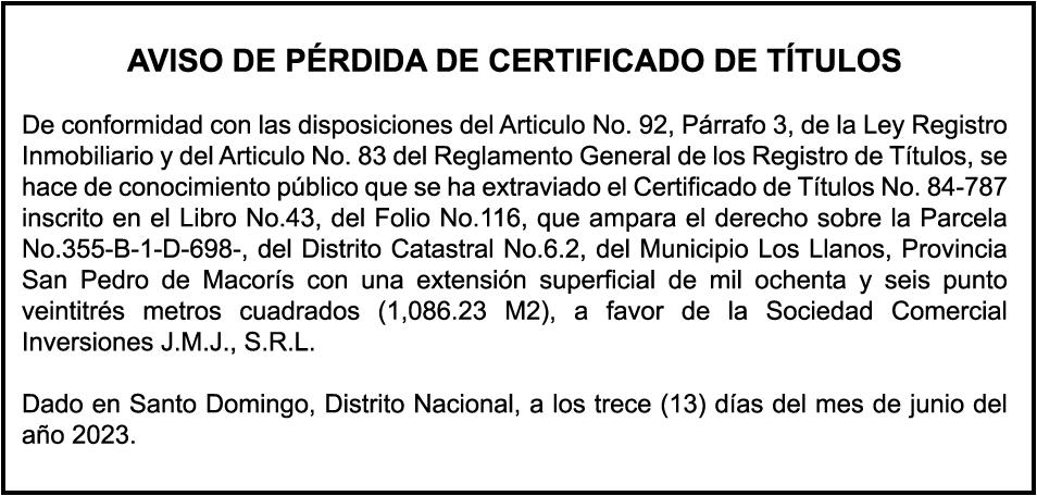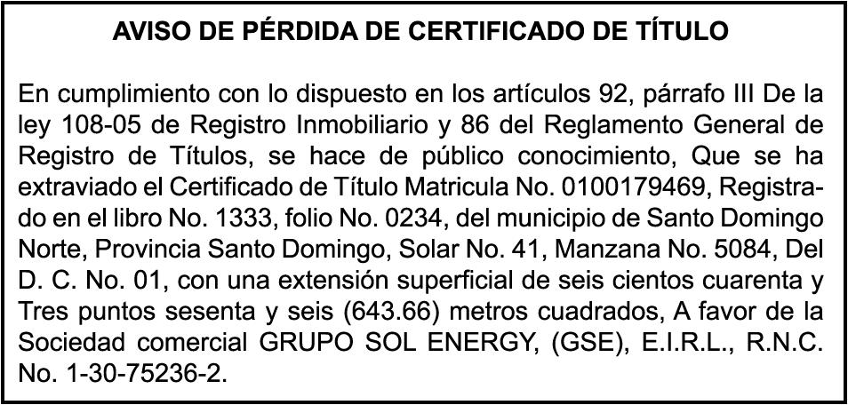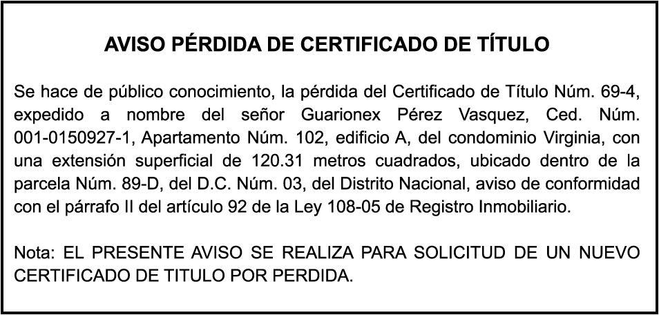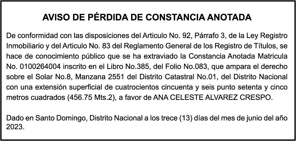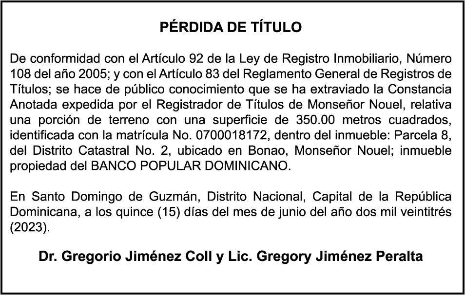 PERDIDA DE PLACA No. K1991372, Motocicleta SUZUKI, Modelo AX 100, Color ROJO, Año 2020, Chasis LC6PAGA12L0013957, a nombre de INVERSIONES LEANDRO MOTORS SRL. SE hace de público conocimiento la pérdida de certificado de depósito número 794340141 emitido Banco Popular Dominicano, S. A., a favor de MARINA LAUREANO LAUREANO Cédula de Identidad y Electoral número 026-0001050-4, expedido en fecha 4 de diciembre de 2015 por el monto de (RD$302,497.06).