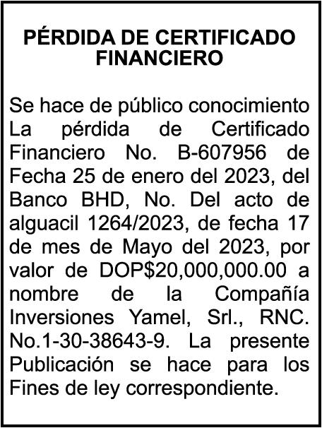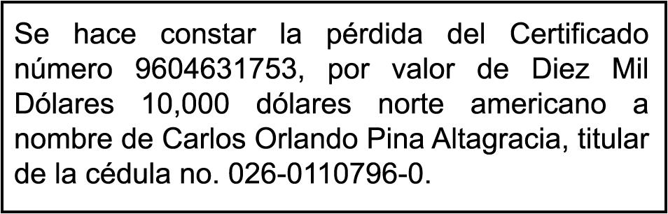 SE hace de público conocimiento la pérdida de certificado de depósito número 783120538 emitido Banco Popular Dominicano, S. A., a favor de ANA OFELIA PEREZ MELO Cédula de Identidad y Electoral número 026-00970194, expedido en fecha 22 de noviembre de 2013 por el monto de (RD$830,136.47).