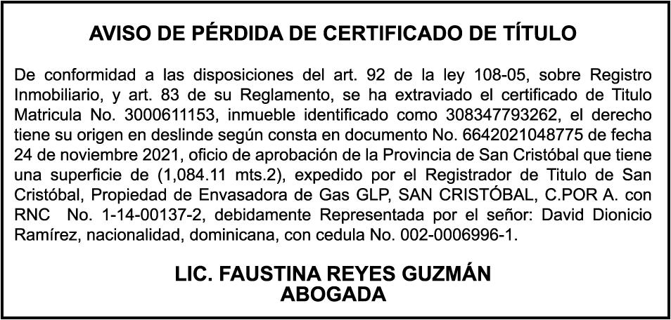 SE hace de público conocimiento la pérdida de certificado de depósito número 794340141 emitido Banco Popular Dominicano, S. A., a favor de MARINA LAUREANO LAUREANO Cédula de Identidad y Electoral número 026-0001050-4, expedido en fecha 4 de diciembre de 2015 por el monto de (RD$302,497.06).