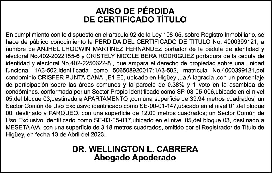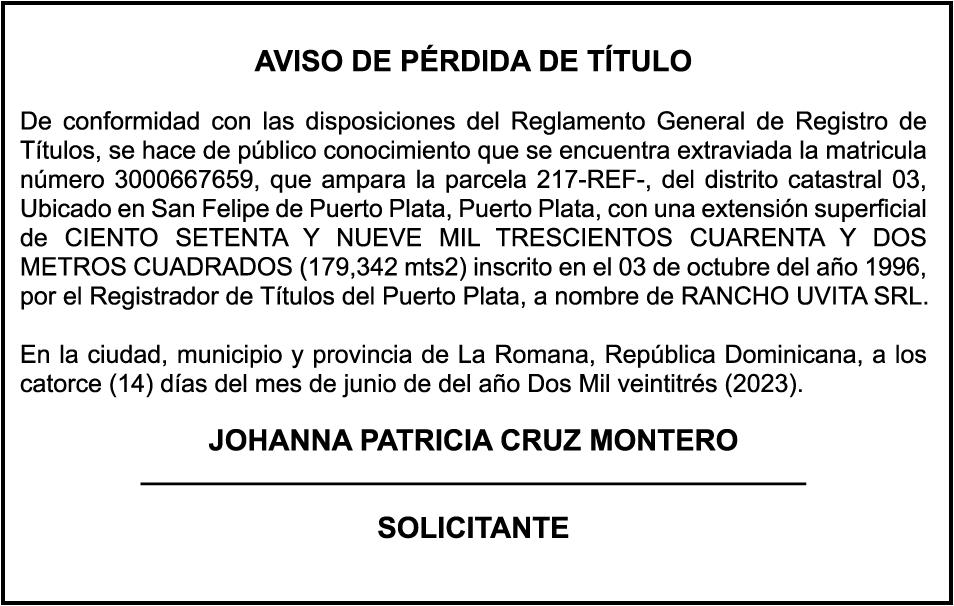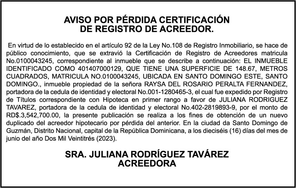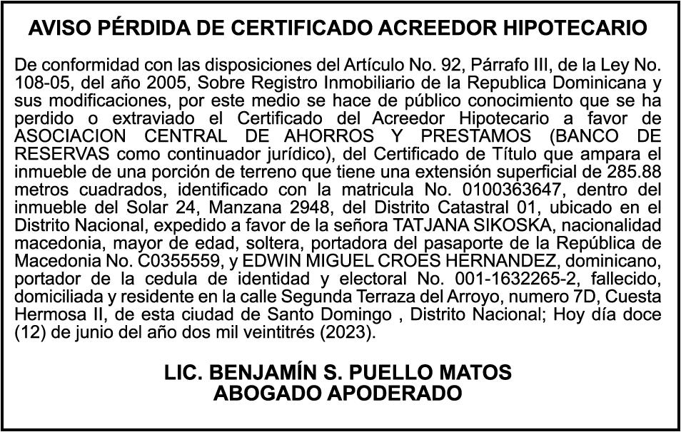 SE hace de público conocimiento la pérdida de certificado de depósito número 831436357 emitido Banco Popular Dominicano, S. A., a favor de ROSA ARIAS DE GARCIA Cédula de Identidad y Electoral número 023-0103113-0, expedido en fecha 30 de diciembre de 2022 por el monto de (RD$222,298.95).