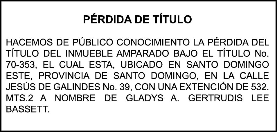 SE hace de público conocimiento la pérdida de certificado de depósito número 775489354 emitido Banco Popular Dominicano, S. A., a favor de EVA MARIELA GONZALEZ PAREDES Cédula de Identidad y Electoral número 001-1443102-6, expedido en fecha 30 de julio de 2012 por el monto de (RD$148,395.79).