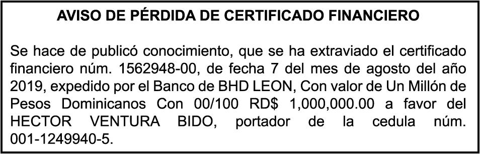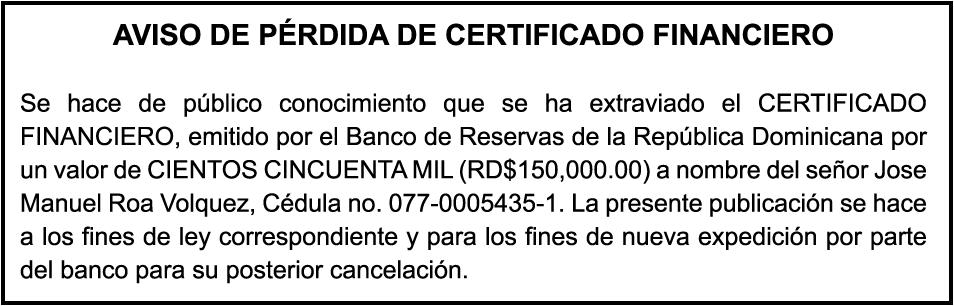 FINANCIERO , se hace de público conocimiento la pérdida del certificado financiero no.001-0109619, por el monto de RD$ 1,200.00, emitido por La Asociación Romana de Ahorros y Préstamos a favor de los señores Roberto Antonio Candelario Guillen y/o Rafael Antonio Candelario Guillen, dominicano, mayores de edad, titulares de las cedulas de identidad y electoral nos. 026-0020712-6 y 026-0058747-7, domiciliados y residentes en esta ciudad de la romana.