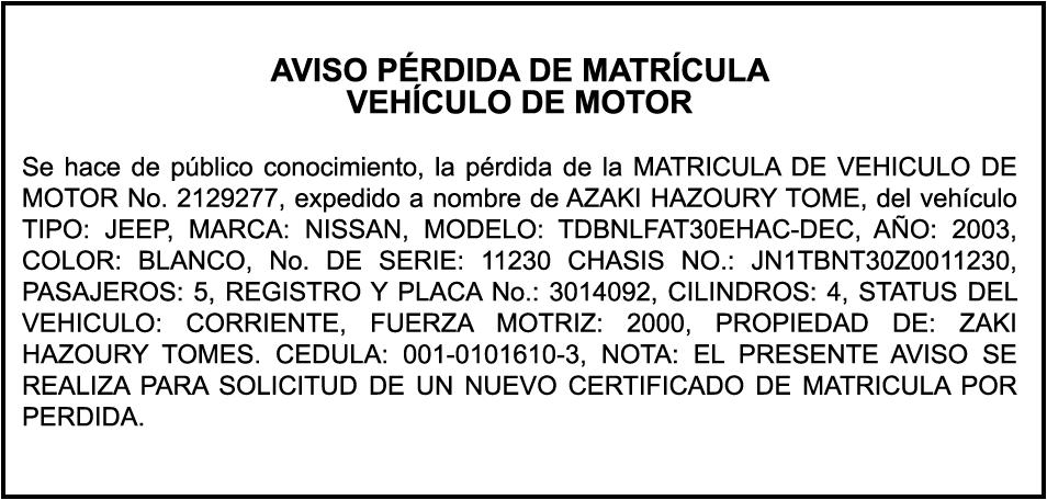 PERDIDA DE MATRICULA: Del Automovil Privado, Placa A048515, Chasis TSK30001901, Marca NISSAN, Modelo SENTRA, AñO 1999, Color BLANCO, a nombre de AGENCIA DE CARRRO PP C POR A, RNC102340234
