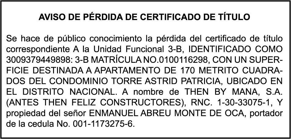 SE hace de público conocimiento la pérdida de certificado de depósito número 783808272 emitido Banco Popular Dominicano, S. A., a favor de ROCIO BYAS GARCIA Cédula de Identidad y Electoral número 023-0035626-4, expedido en fecha 14 de enero de 2014 por el monto de (RD$394,290.19).