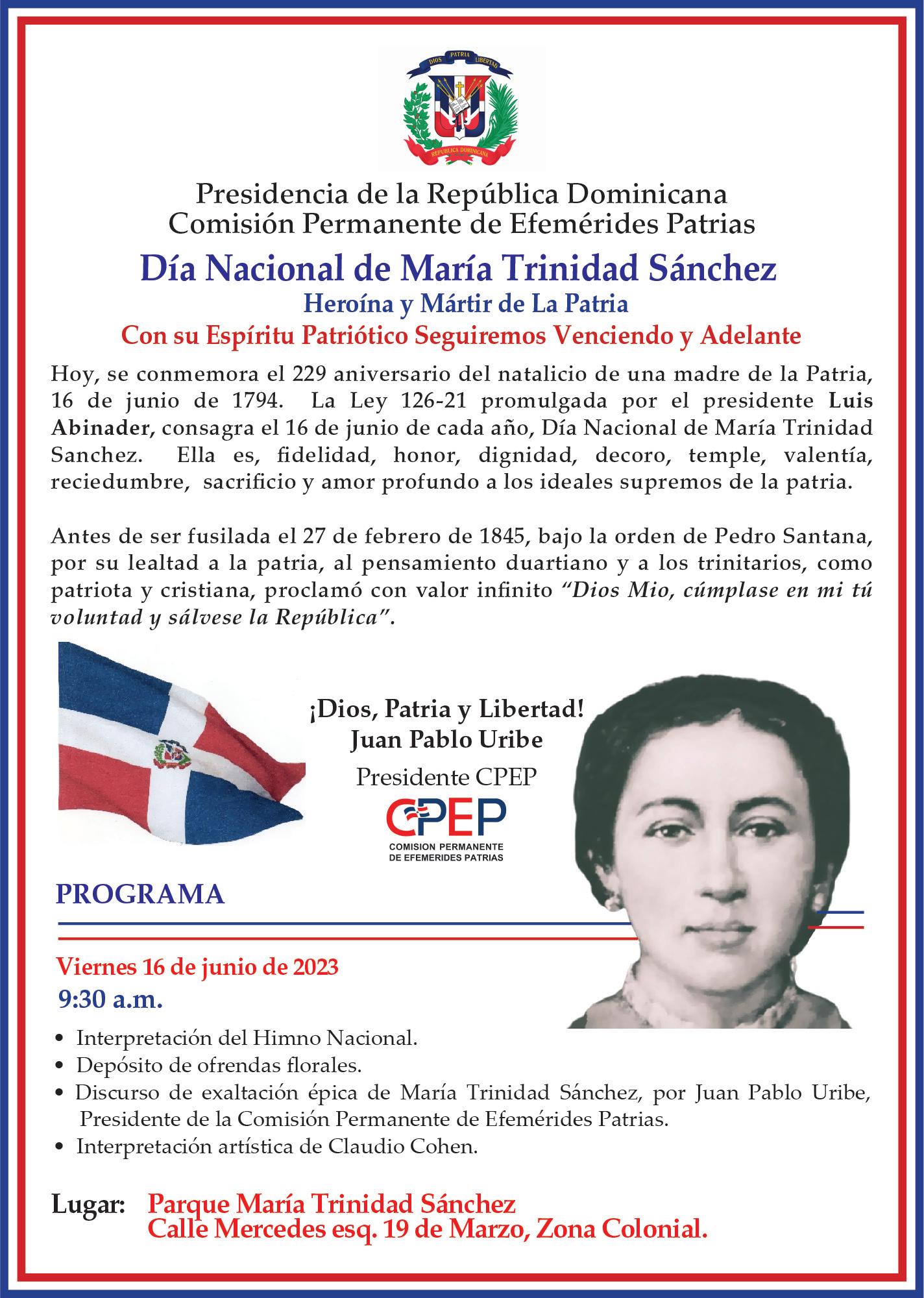 16 de junio de 1794. Nace en la ciudad del Ozama, María Trinidad Sánchez, quien habría de convertirse en uno de los más firmes sostenedores del ideal de Independencia del pueblo dominicano, frente a la dominación haitiana. Fue una de las asistentes al Baluarte del Conde la noche del martes 27 de febrero de 1844.