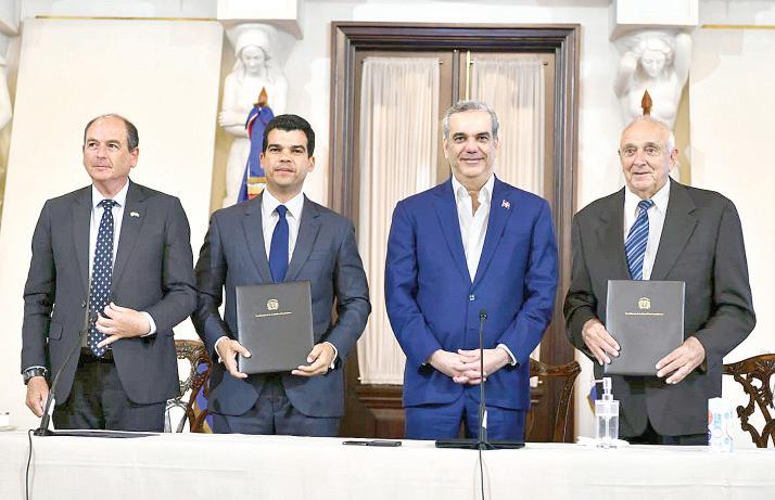 Yithak Aharonovitch, presidente de Mekorot, izquierda, y Wellington Arnaud, director del Inapa, firmaron el convenio en el Palacio Nacional. Observa Daniel Biran, embajador de Israel en el país. P.10