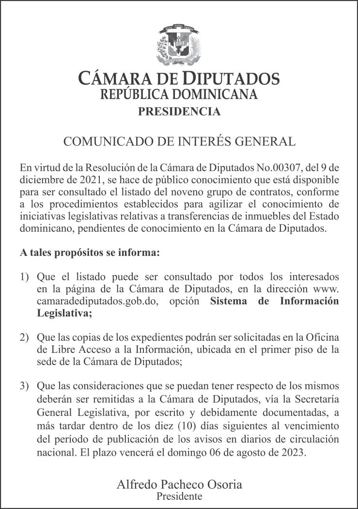 9:00 A.M. Vista pública sobre Ley de Alquileres. Salón Asamblea Nacional, Congreso Nacional.
