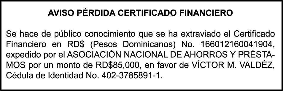 SE hace de público conocimiento la pérdidas de certificado de depósito número 813820255 emitido Banco Popular Dominicano, S. A., a favor de ABDALAH ABEL HASBUN Cédula de Identidad y Electoral número 001-1378479-7, expedido en fecha 12 de junio de 2019 por el monto de (RD$1,000,000.00), más intereses generados a la fecha.