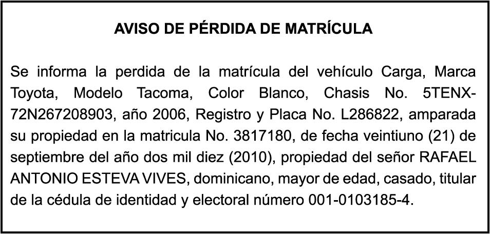 PERDIDA DE PLACAMarca MACK, Modelo CXU613 600, Color BLANCO, Año 2008, Placa L439508, Chasis 1 M 1A W 0 2Y0 8 N 0 0 3 28 8 , A nombre de CHASIS MARINE DOMINICANA CHAMARDOM SRL.
