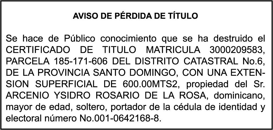 SE hace de público conocimiento la pérdidas de certificado de depósito número 768741704 emitido Banco Popular Dominicano, S. A., a favor de ROSARIO A. CABA SANCHEZ Cédula de Identidad y Electoral núm e ro 0 0 1-017 9 127-5 , expedido en fecha 12 de agosto de 2011 por el monto de (RD$110,795.55), más intereses generados a la fecha.