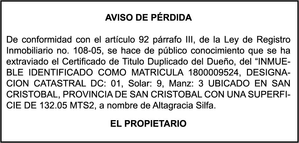 SE hace de público conocimiento la pérdida de certificado de depósito número 771801263 emitido por Banco Popular Dominicano, S. A., a favor de JACINTO ANTONIO SANTOS RUANE Cédula de Identidad y Electoral número 023-0029716-1, expedido en fecha 19 de enero de 2012 por el monto de (US$9,093.31), más intereses generados a la fecha.