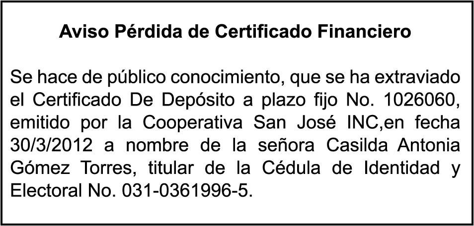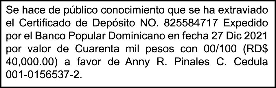 SE hace de público conocimiento la pérdida de certificado de depósito número 828644252 emitido por Banco Popular Dominicano, S. A., a favor de ISRAEL FLORENTINO Cédula de Identidad y Electoral número 001-0312480-6, expedido en fecha 12 de julio de 2022 por el monto de (RD$316,477.53), más intereses generados a la fecha.