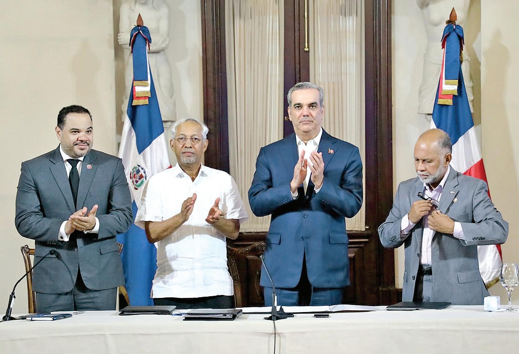 El ministro de Educación, Ángel Hernández y el presidente de la Asociación Dominicana de Profesores, Eduardo Hidalgo, firmaron ayer en el Palacio Nacional un acuerdo por la educación, con el presidente Luis Abinader, y el defensor del Pueblo, Pablo Ulloa, como testigos. Las partes garantizaron el año escolar y cumplir las demandas de los docentes.