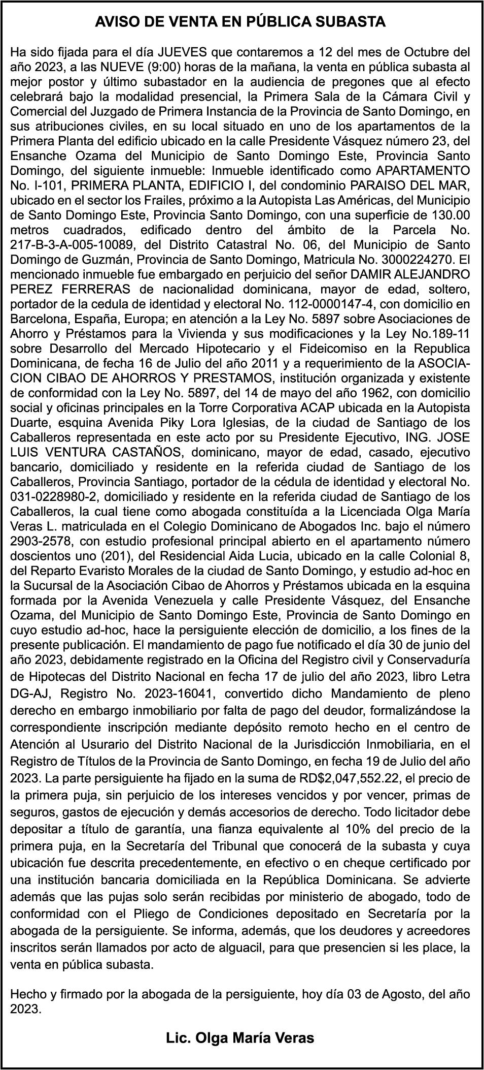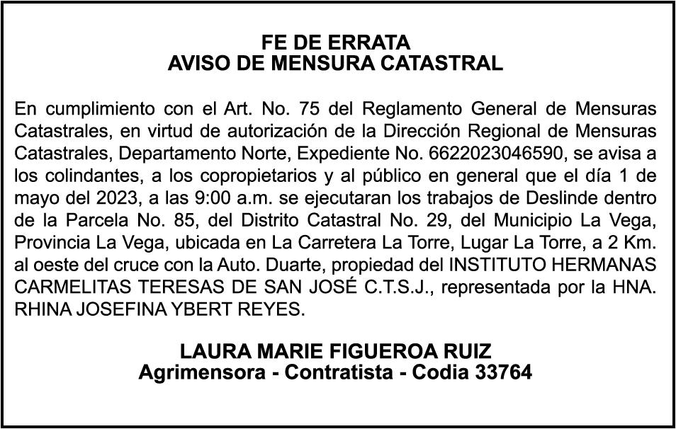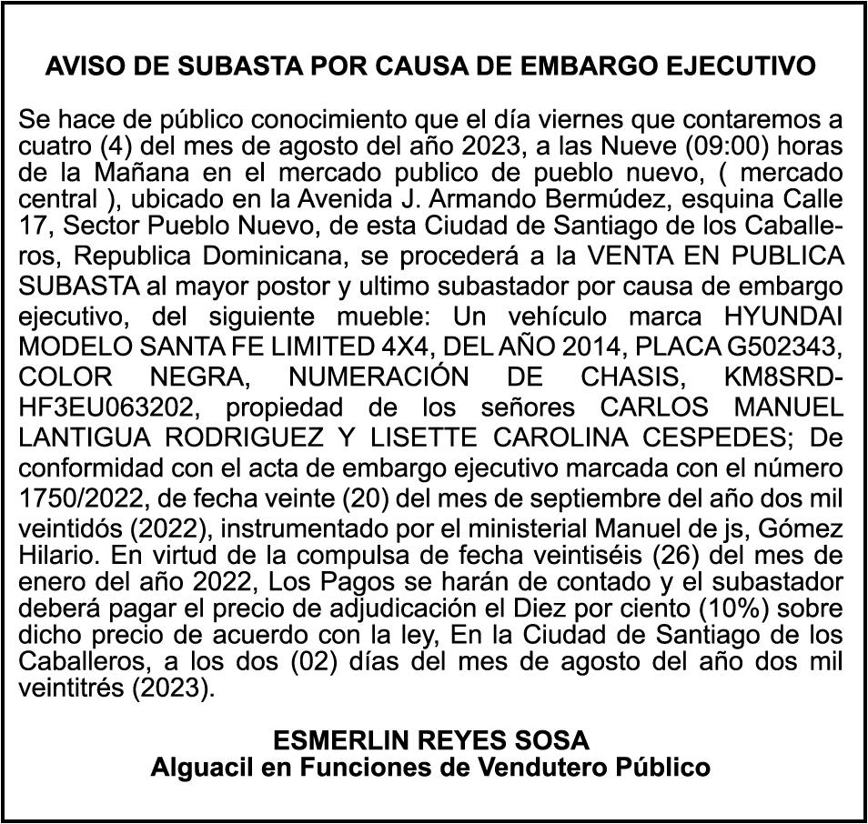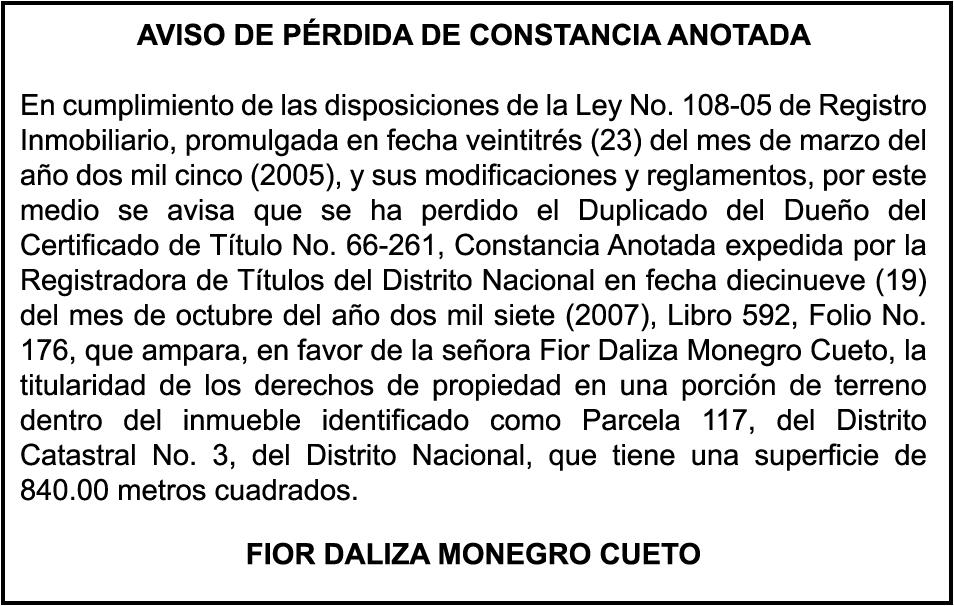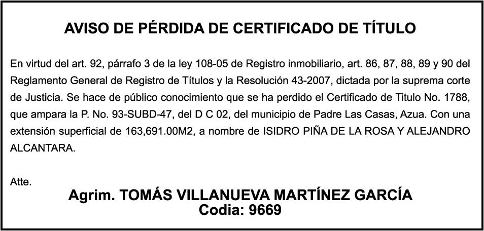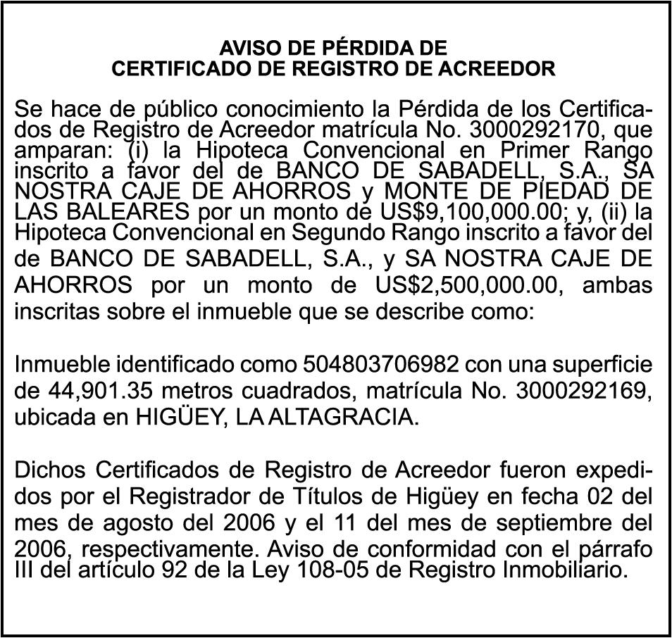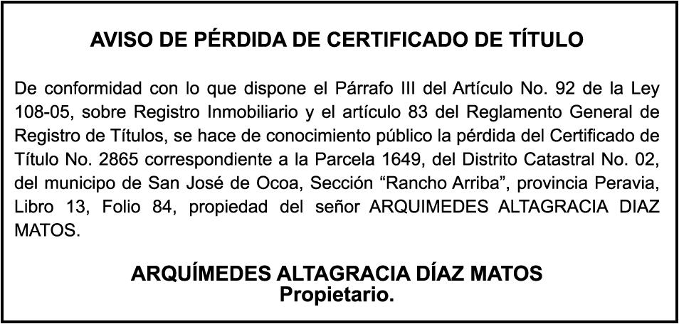 PERDIDA DE MATRICULA: Del Automovil , Placa A647592, Chasis 3N1BC1CP3AL147105, Marca NISSAN, Modelo VERSA S AñO 2010, Color GRIS, a nombre de C M VIDA Y ESPERANZA EIRL, RNC.131220584