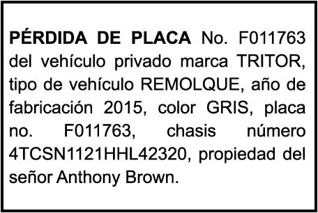 PERDIDA DE PLACA No. L179036, Veh. CARGA