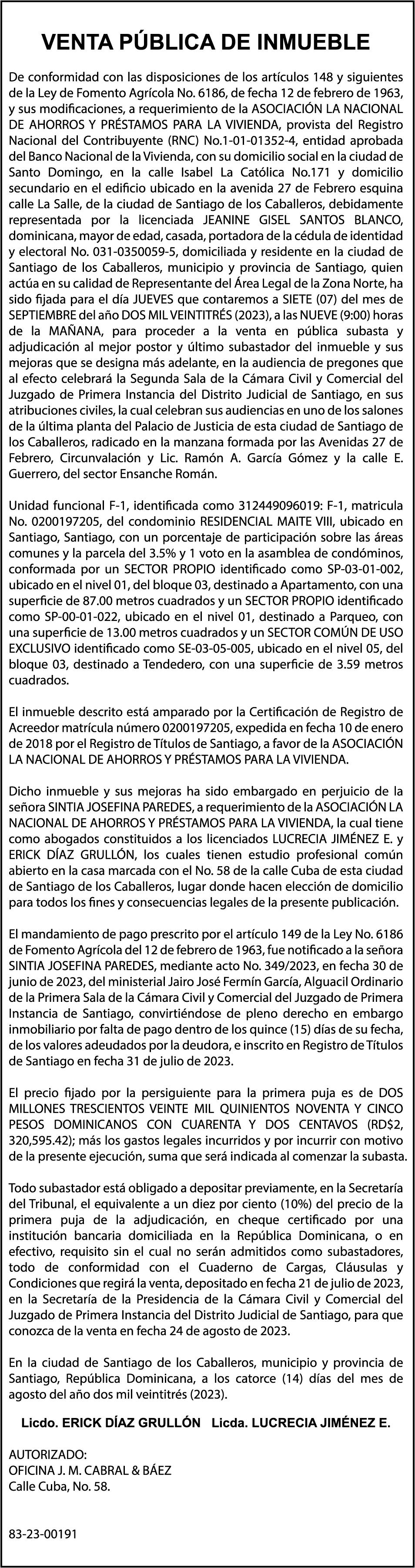 GIUDICELLI Cedula de identidad y Electoral número 001-18880624, expedido en fecha 9 de mayo de 2023 por el monto de (RD$5,300,930.47), más intereses generados a la fecha.