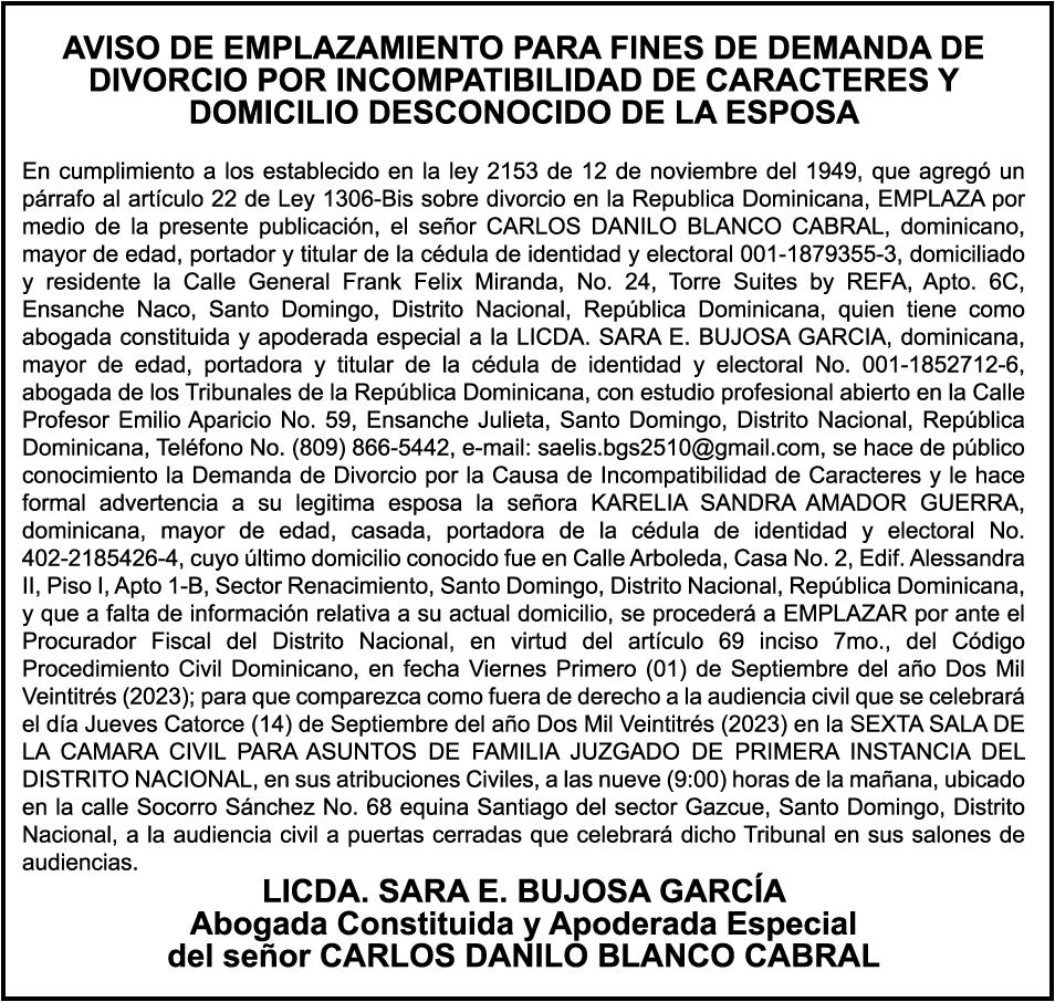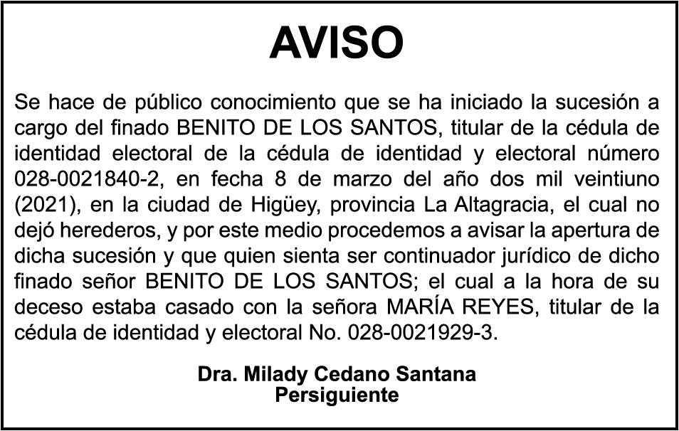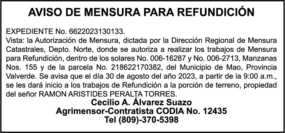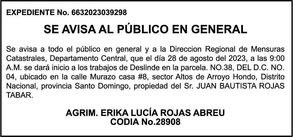 AVISO: cambio de nombre de embarcación. Se hace de público conocimiento, que se le está cambiando el nombre a la embarcación de nombre “AMAPOLA”, de 15 pies de eslora, matriculado No. BR-A1731979SDG, propiedad del señor FEDERICO CESAR GRULLON MENCIA, para que en lo adelante se haga figurar con el nombre de (LAS FEDAS), en vez del primero.