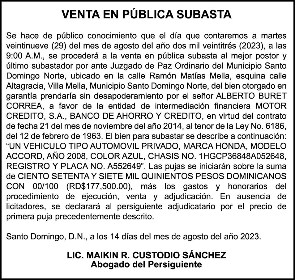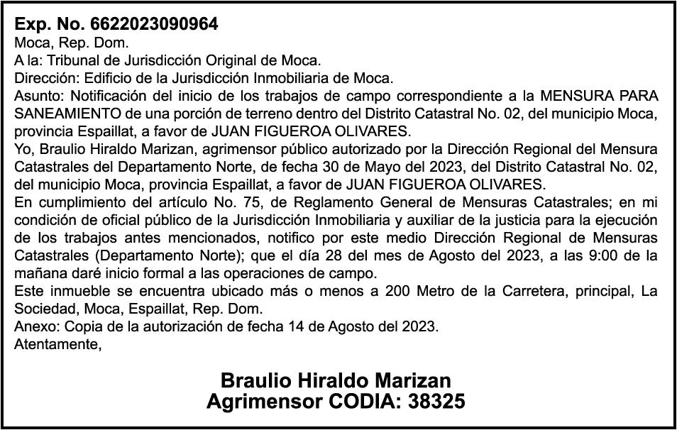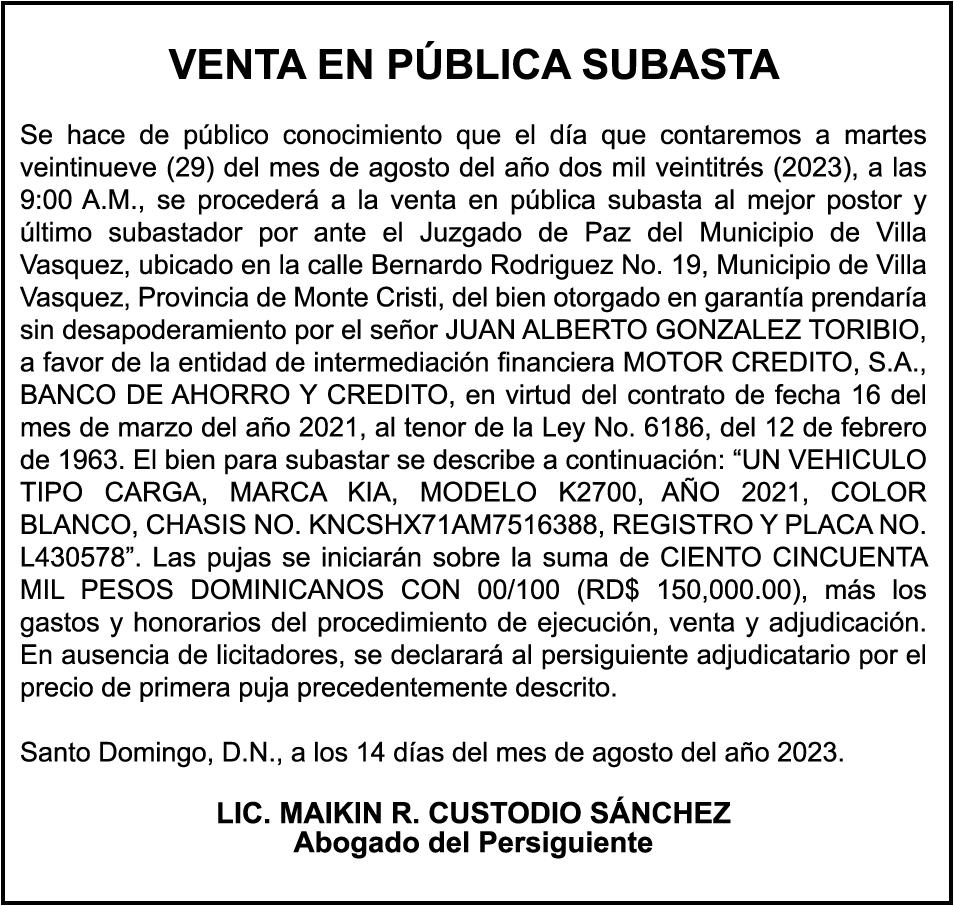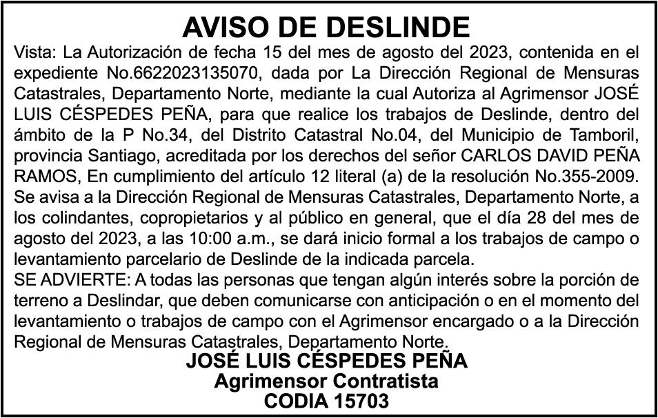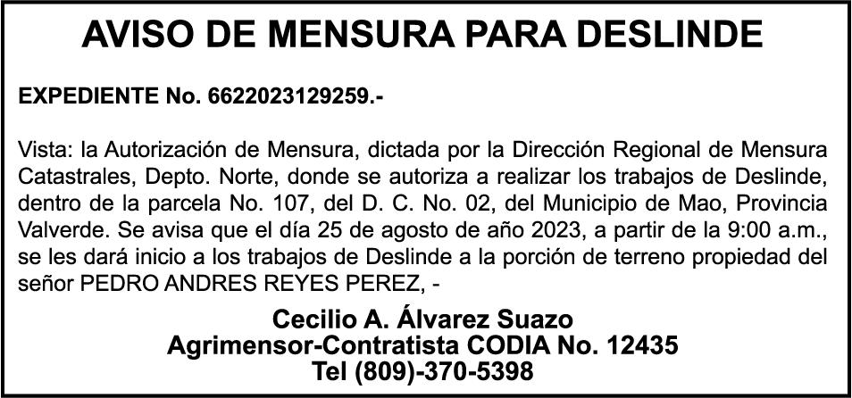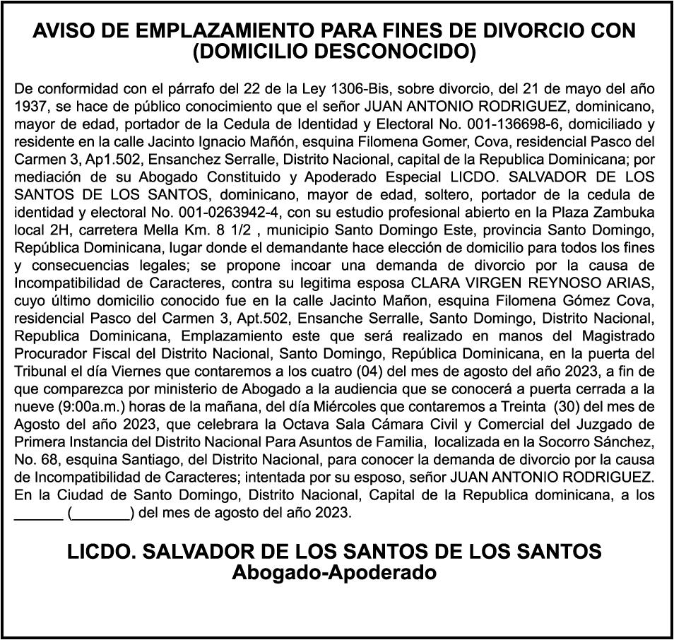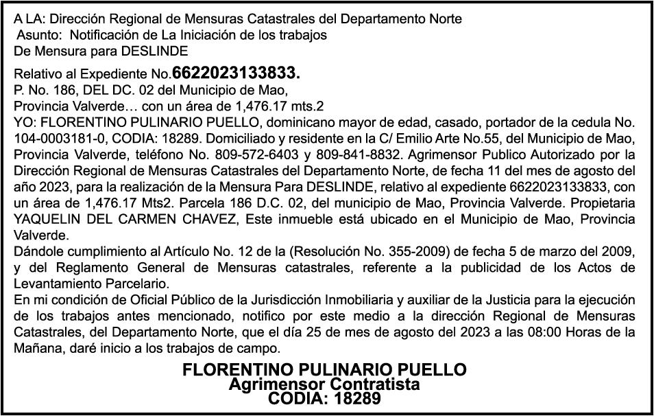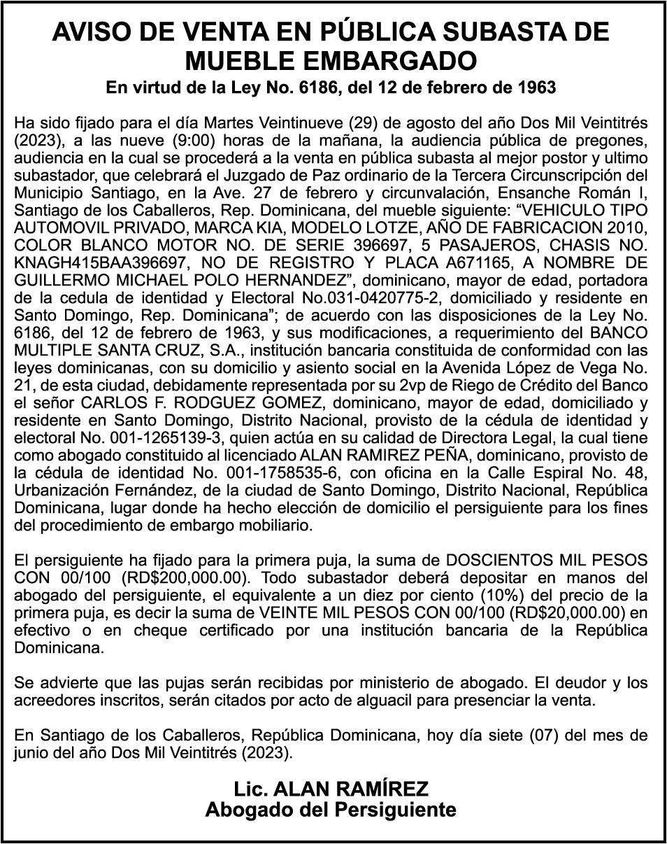 AVISO:TRASPASO DE EMBARCACION. EL SEÑOR. FRANCISCO DEL ROSARIO GUZMAN HENRIQUEZ, TRASPASA LA EMBARCACION DE NOMBRE “DON GOYO”, MATRICULA. NO. BPD50-1076SBS, DE 18.0 PIES DE ESLORA, COLOR BLANCO, AL SEÑOR. MARCELO MENDEZ FONDEUR, COMO NUEVO PROPIETARIO.