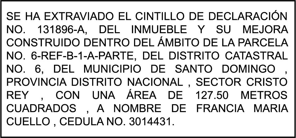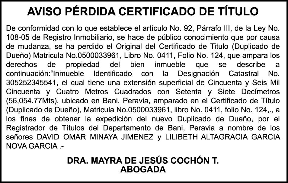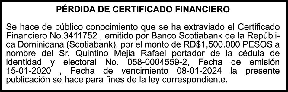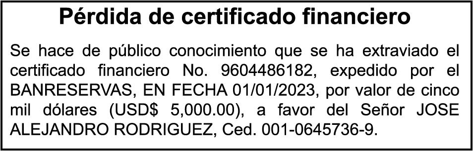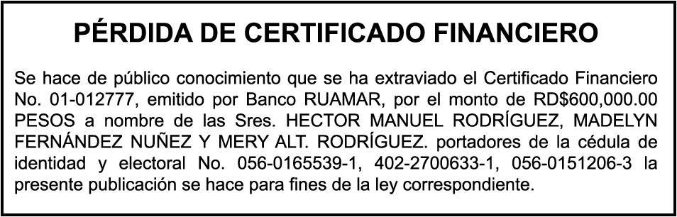 DIAZ. SE hace de público conocimiento la pérdida de certificado de depósito número 833732480 emitido por Banco Popular Dominicano, S. A., a favor de YANIS MARIA BARINAS