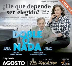 8:30 P.M. Presentación de la obra “Doble o Nada”. Teatro Lope de Vega Santo Domingo. 2do. nivel, Novocentro.