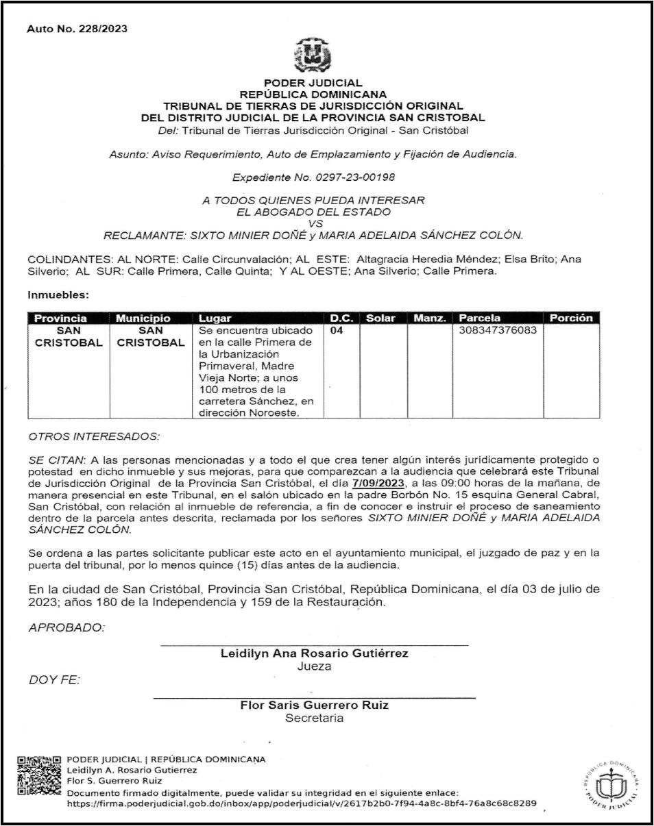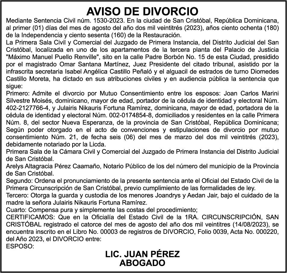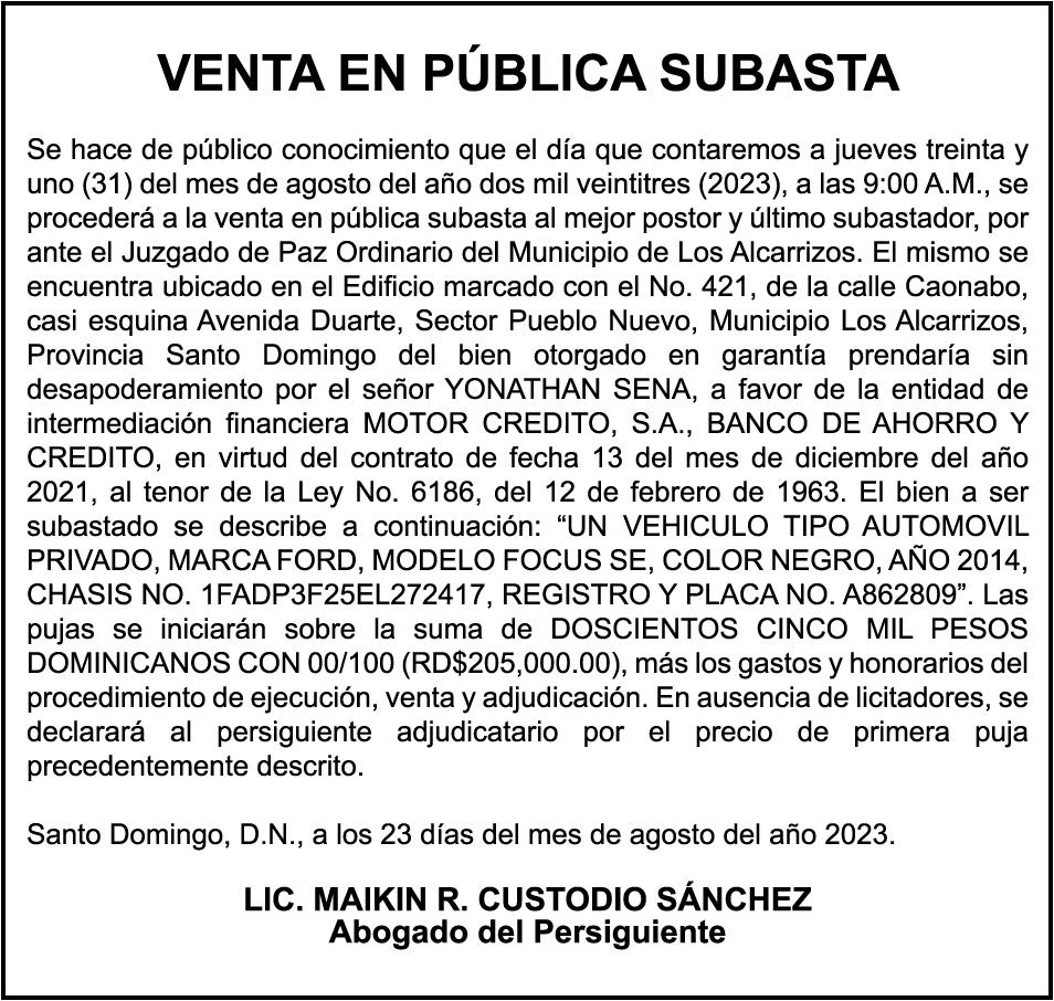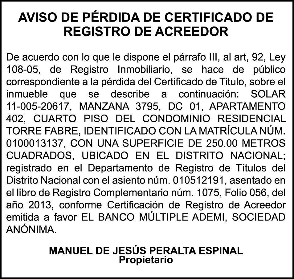 LYSTC111XM1000908, placa K2229878, a nombre de SANTIAGO ROCA VALERO. SE hace de público conocimiento la pérdida de certificado de depósito número 814350138 emitido por Banco Popular Dominicano, S. A., a favor de ESTERVINA JIMENEZ DE LEON DE VLYT Cedula de identidad y Electoral número 001-1463821-6, expedido en fecha 17 de julio de 2019 por el monto de (RD$298,166.07), más intereses generados a la fecha.