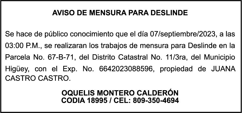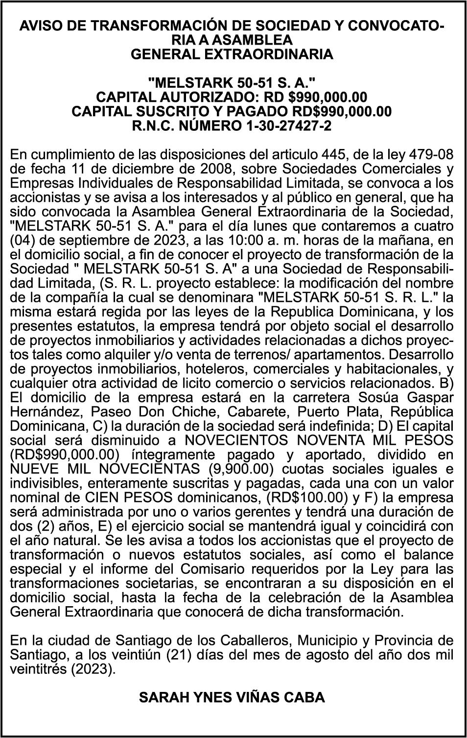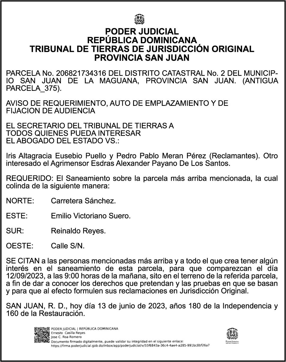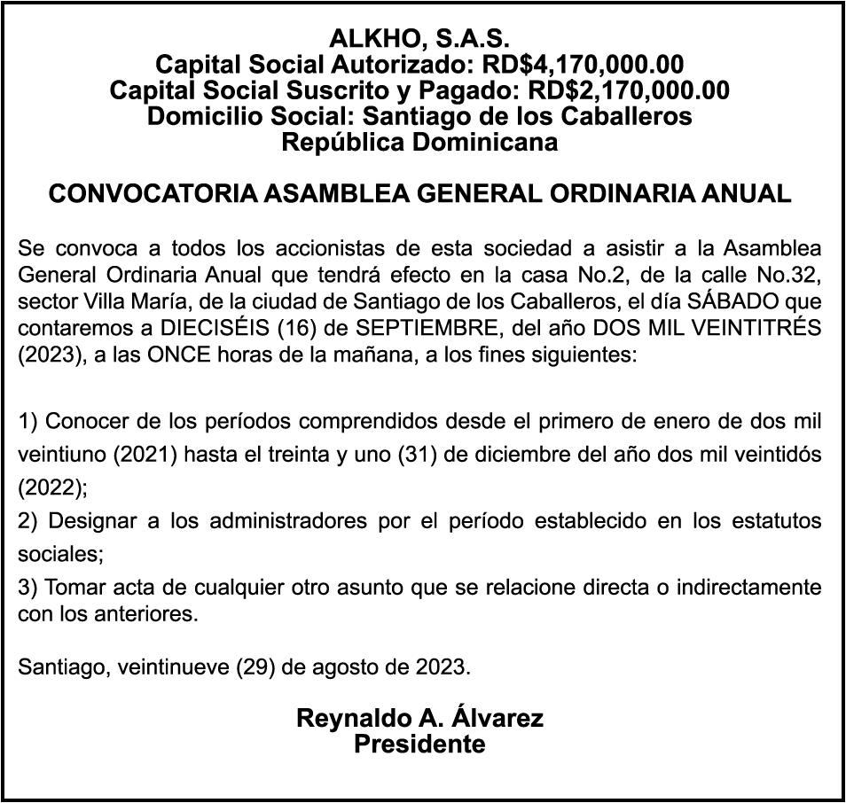 PERDIDA DE MATRICULA:Del JEEP, Placa G555992, 1C4SDJCT2FC245771, Marca DODGE,Modelo DURANGO R/T 4WD,AñO 2015, Color BLANCO,a nombre de AMAURY JOEL REYES RODRIGUEZ, 03105018646 PERDIDA DE PLACA No. K0558857, Motocicleta FORCE, Modelo CG150, Color NEGRO, Año 2010, Chasis LWPPCK1BF20110398, a nombre de JUAN VALOY RINCON. PERDIDA DE MATRICULA CARGA MARCA: FORD, MODELO: F-150, AÑO: 2006, COLOR: GRIS,PLACA: L271521,CHASIS: 1FTPW14V06KD29738, PROPIEDAD DE: RAMON EMILIO JAQUEZ JAQUEZ SE hace de público conocimiento la pérdida de certificado de depósito número 833652548 emitido por Banco Popular Dominicano, S. A., a favor de LUIS ALBERTO BENJAMIN ELMUFDI MATTAR Cedula de identidad y Electoral número 026-0118844-0, expedido en fecha 4 de mayo de 2023 por el monto de (RD$5,112,381.51),más intereses generados a la fecha.