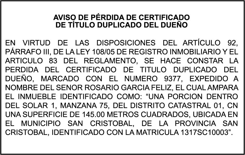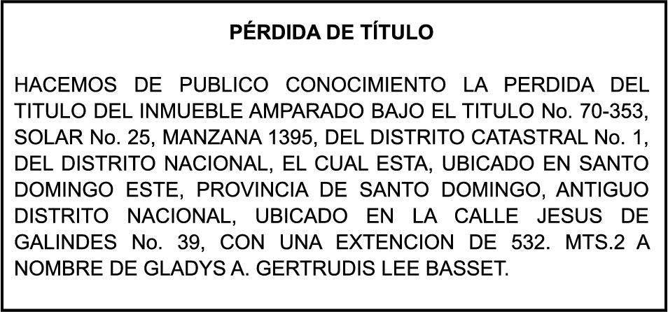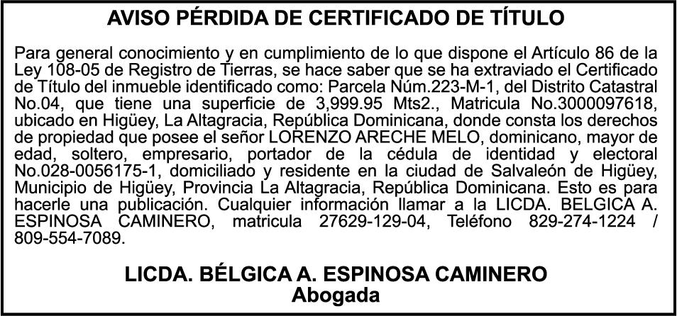 SE hace de público conocimiento la pérdida de certificado de depósito número 830717955 emitido por Banco Popular Dominicano, S. A., a favor de GERTRUDIS ALTAGRACIA RONDON NOVA DE ESPINOSA Cedula de identidad y Electoral número 001-0107552-1, expedido en fecha 12 de noviembre de 2022 por el monto de (RD$1,050,226.85), más intereses generados a la fecha.