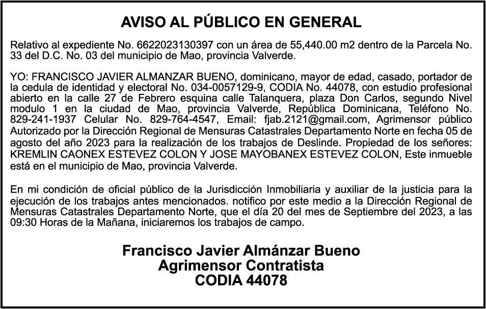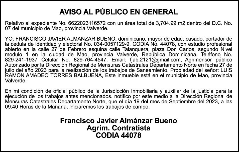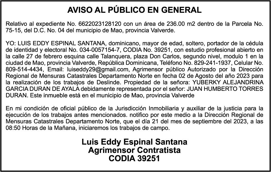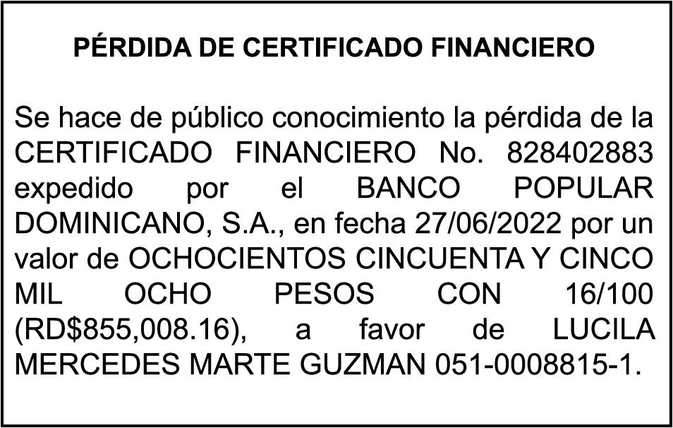 SE hace de público conocimiento la pérdida de certificado de depósito número 833652548 emitido por Banco Popular Dominicano, S. A., a favor de LUIS ALBERTO BENJAMIN ELMUFDI MATTAR Cedula de identidad y Electoral número 026-0118844-0, expedido en fecha 4 de mayo de 2023 por el monto de (RD$5,112,381.51),más intereses generados a la fecha.