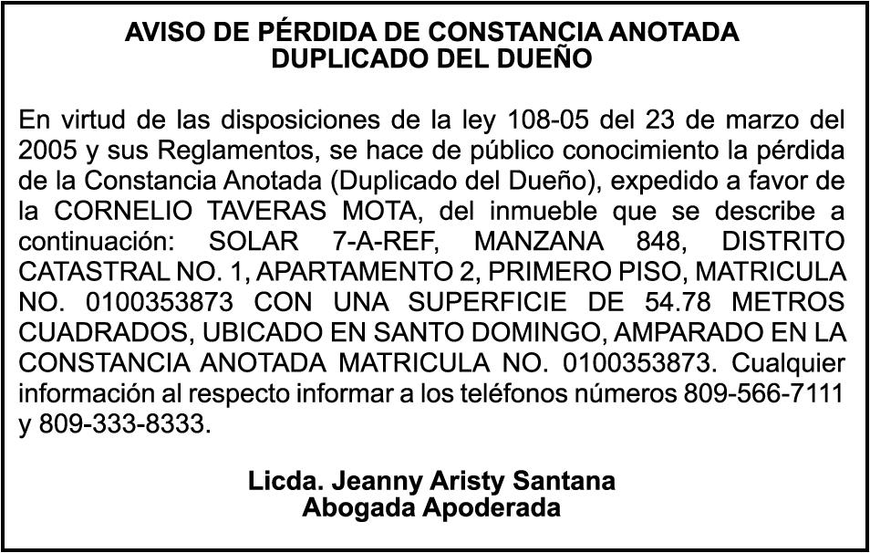 SE hace de público conocimiento la pérdida de certificado de depósito número 730721487 emitido por Banco Popular Dominicano, S. A., a favor de JEIMY DELGADO ESPINOSA Cedula de identidad y Electoral número 001-1641615-7, expedido en fecha 17 de marzo de 2006 por el monto de (RD$19,635.26), más intereses generados a la fecha.