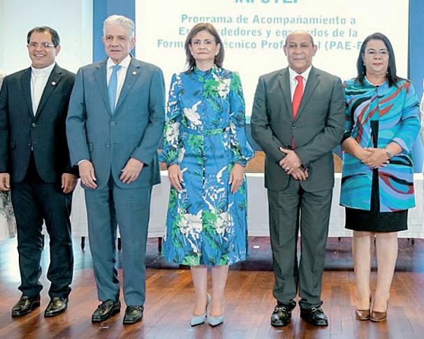 La vicepresidenta, Raquel Peña, y el director del Infotep, Rafael Santos Badía, presentaron el Programa de Apoyo a Emprendedores de la Formación Técnico Profesional, en beneficio de 450 jóvenes de comunidades vulnerables de la provincia Santiago. P.16