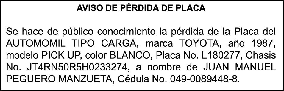 PERDIDA DE PLACA No. L154486, del vehículo marca DAIHATSU, Modelo V11 8L HY, año 1999, color ROJO, Chasis No. V11812068, a nombre de JUAN BAUTISTA CONCEPCION MARTINEZ, CED, No. 026-0075946-4