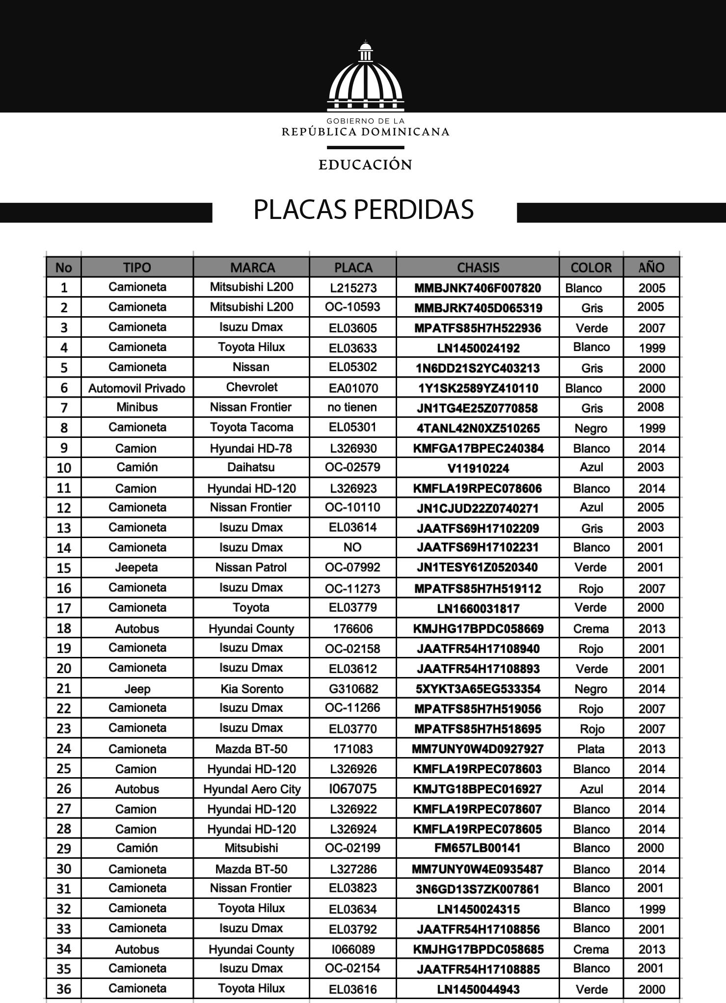 PERDIDA DE MATRICULA Automóvil Privado HYUNDAI, Color blanco, Año 2011, Placa A734956, Chasis KMHEU41MBA798913, a nombre de ANDREA ELIODORA BACILIO PEREZ. VEHICULO DE CARGA MARCA FORD, MODELO RANGER RAPTOR 4WD, COLOR BLANCO, PLACA 467081, CHASIS 6FPPXXMJ2PNR74703, AÑO DE FABRICACION 2022, PROPIETARIO BRAMMY DARIEL TOLEDO BENZANT, CEDULA 402-3833889-7