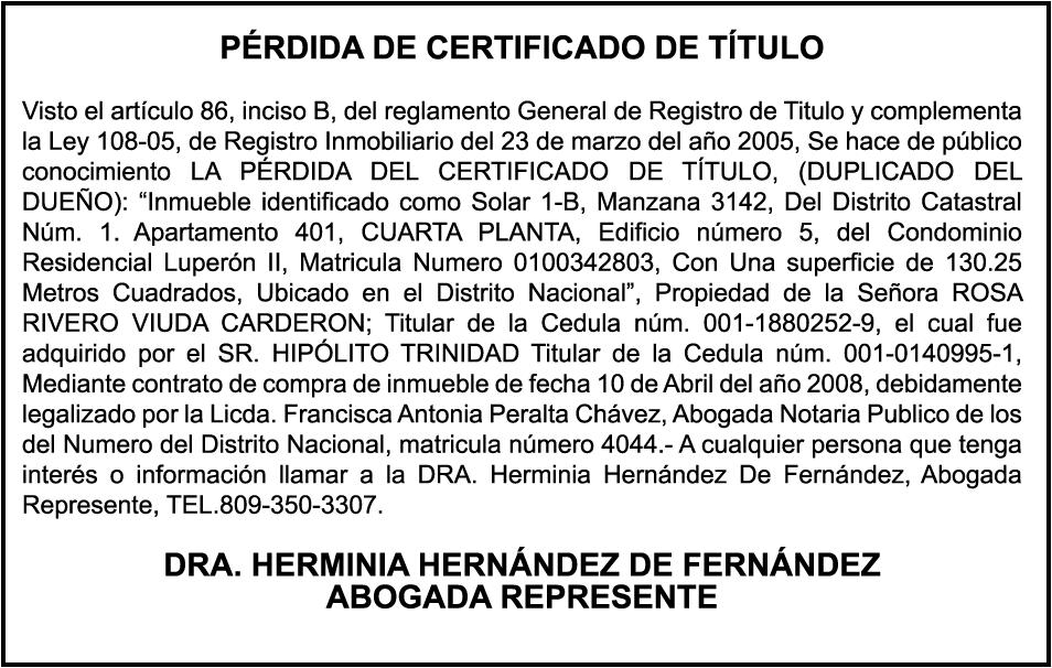 SE hace de público conocimiento la pérdida de certificado de depósito número 812776797 emitido por Banco Popular Dominicano, S. A., a favor de ELISA MARIA TAVAREZ PERROTA Cedula de identidad y Electoral número 402-2515885-2, expedido en fecha 5 de abril de 2019 por el monto de (RD$110,167.44), más intereses generados a la fecha.