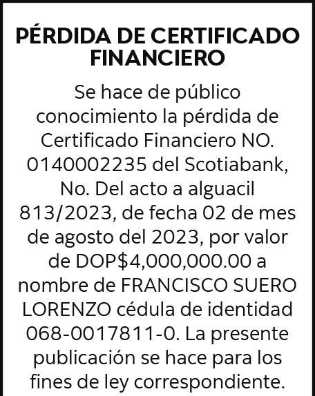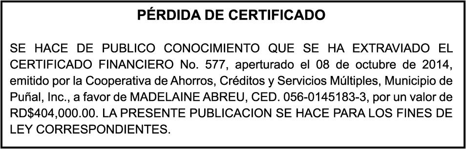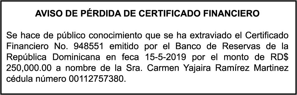 SE hace de público conocimiento la pérdida de certificado de depósito número 831340930 emitido por Banco Popular Dominicano, S. A., a favor de LUZ DALIA ARACHE