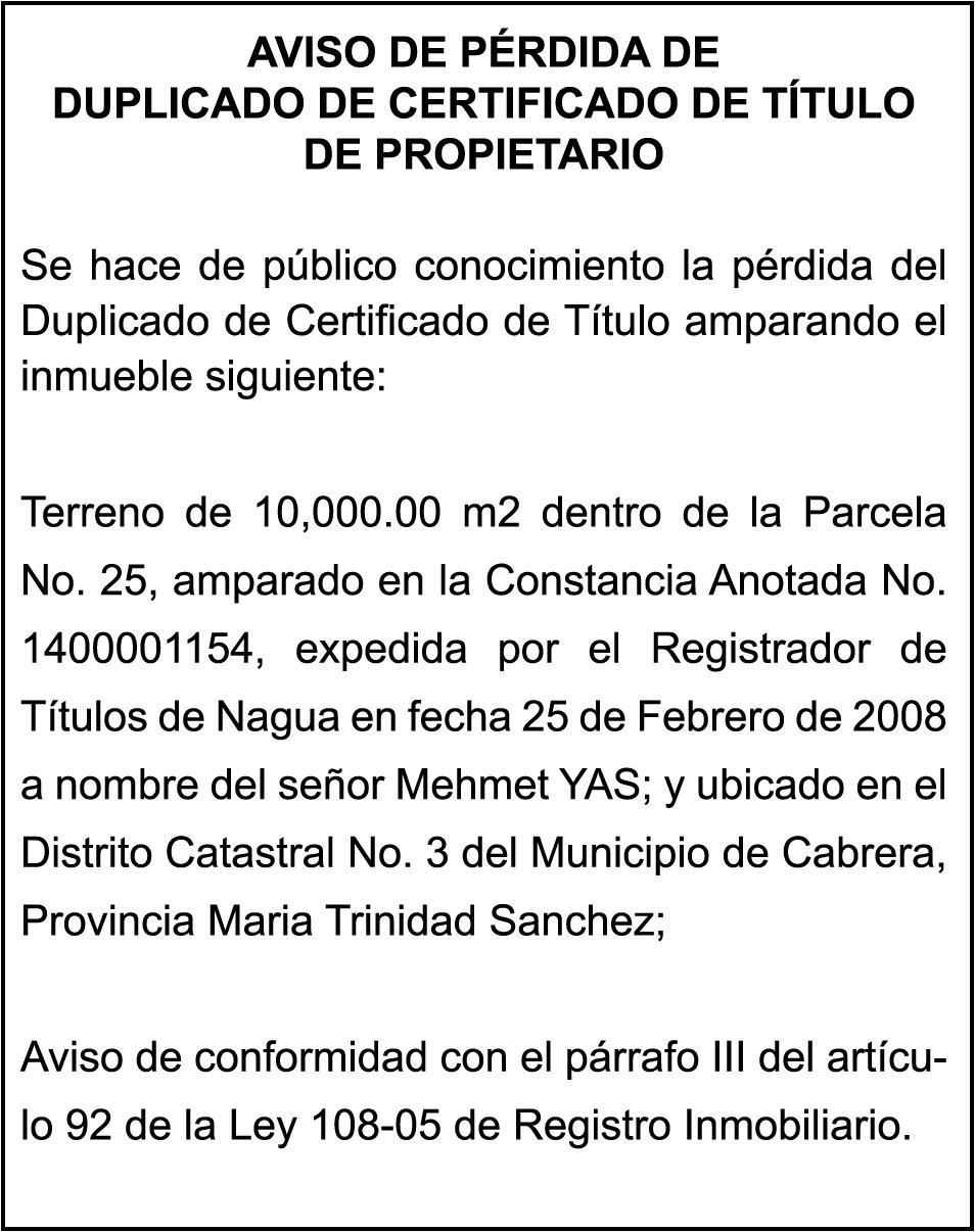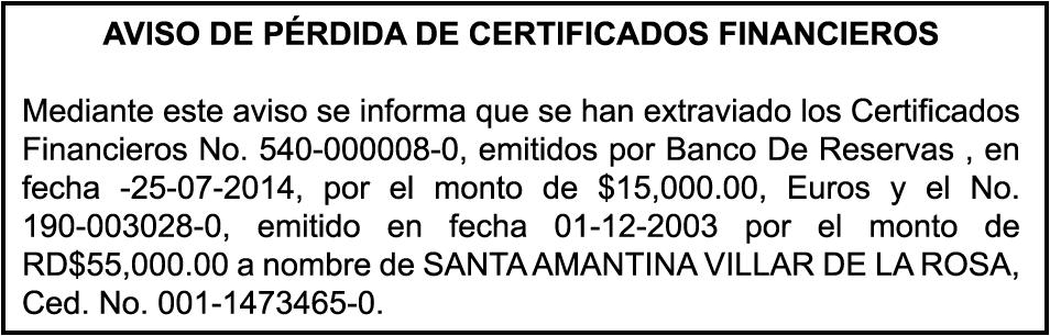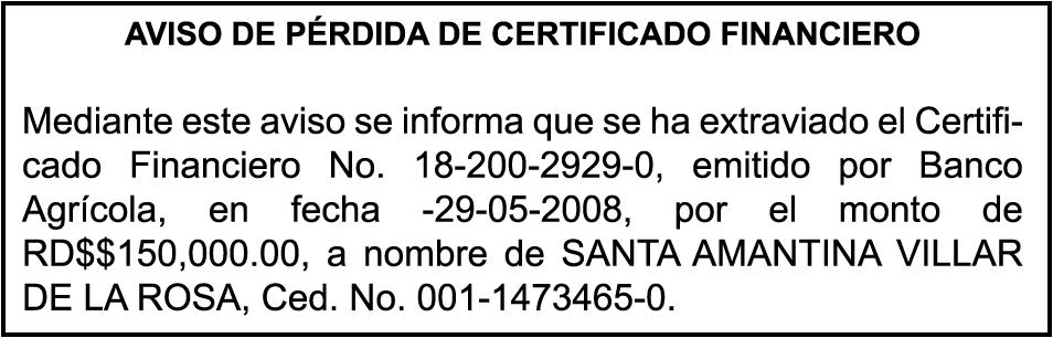 PERDIDA DE CERTIFICADO FINANCIERO se hace de público conocimiento que se ha extraviado el Certificado Financiero No. 1528472, emitido por el BANCO BHD, en fecha 22/10/2018, por el monto de RD$2,000,00.00 (dos millones de pesos), a nombre de LUIS MODESTO ZABALA REYNPOSO Y/O FEDERICO REYNOSO RUIZ, Ced. 002-00449593 Y 002-0138325-4 RESPECTIVAMENTE.