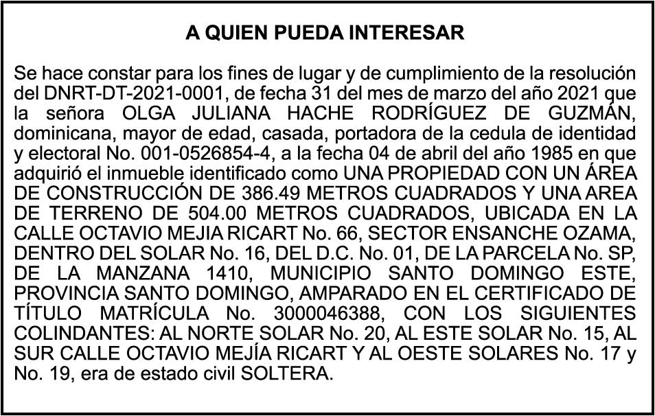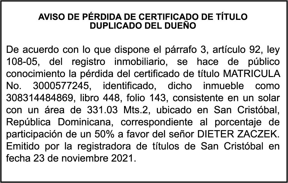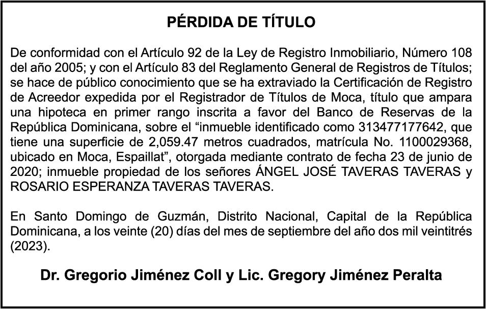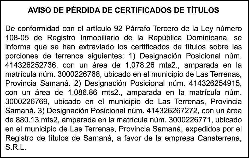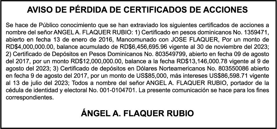 SE hace de público conocimiento la pérdida de certificado de depósito número 823923735 emitido por Banco Popular Dominicano, S. A., a favor de ESPERANZA LINA CHALAS Cedula de identidad y Electoral número 402-28452823, expedido en fecha 14 de septiembre de 2021 por el monto de (RD$328.457,27), más intereses generados a la fecha.