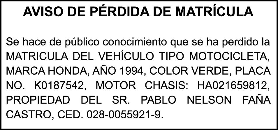 PERDIDA DE MATRICULA Motocicleta DELTA, Modelo AX100, Color NEGRO, Año 2008, Placa K0126927, Chasis RDGHAX200900887, a nombre de RAFAEL REYES HENRIQUEZ.