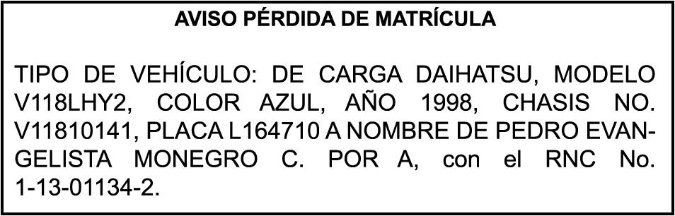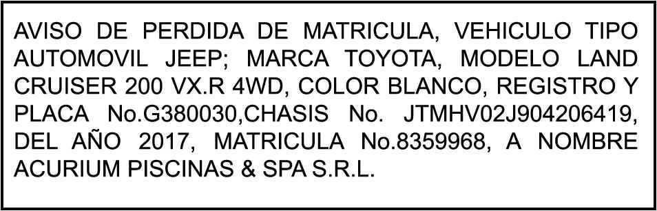 PERDIDA DE PLACA No. L472192, Veh. Carga TOYOTA, Modelo HILUX 4X4, Color blanco, Año 2023, Chasis 8AJKB3CD201653845, a nombre de ROMA SRL., RNC. 101144272