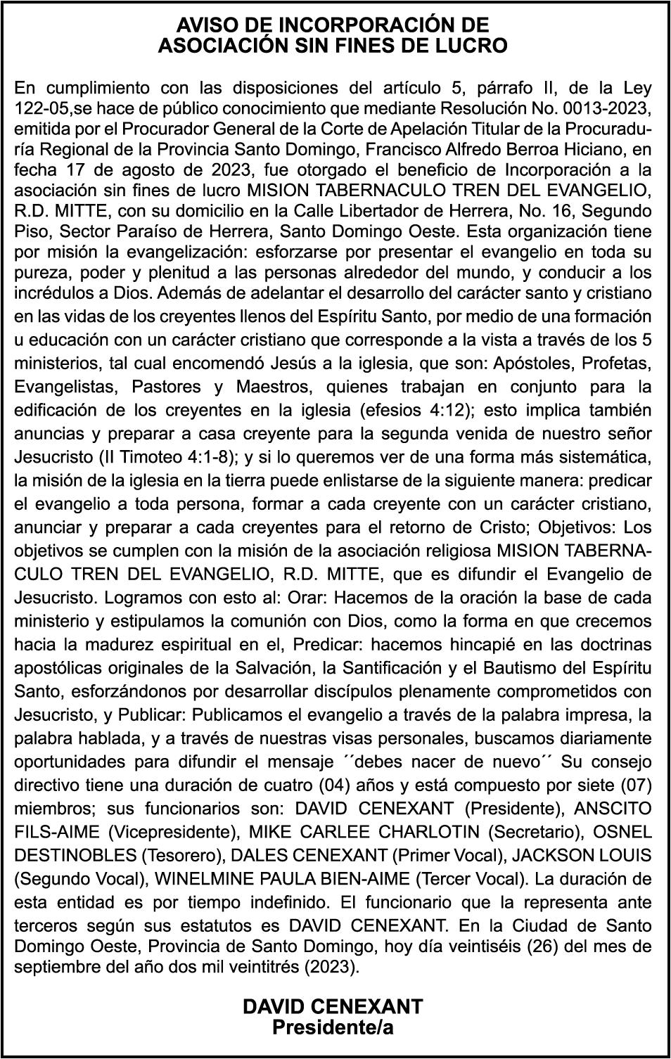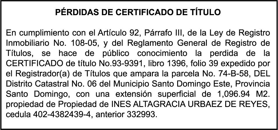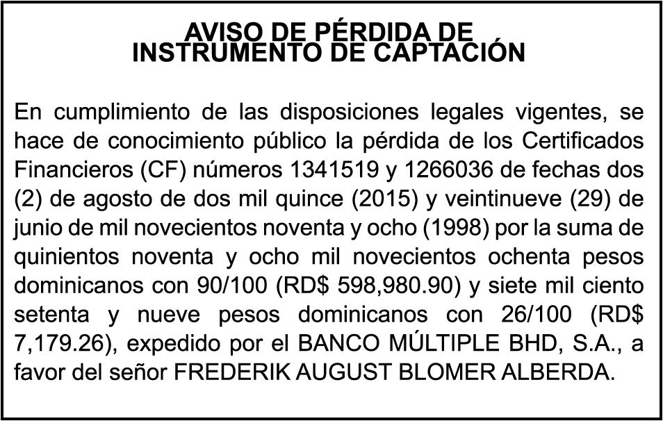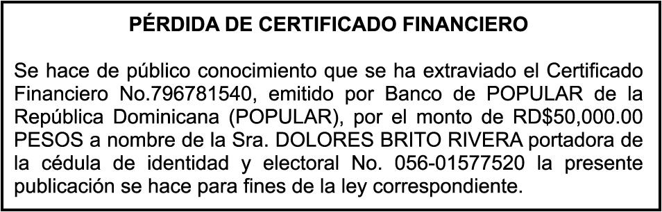 FINANCIERO se hace de público conocimiento que se ha extraviado el Certificado Financiero No. B515922, emitido por el BANCO BHD, en fecha 22/10/2018, por el monto de RD$2,000,00.00 (dos millones de pesos), a nombre de LUIS MODESTO
